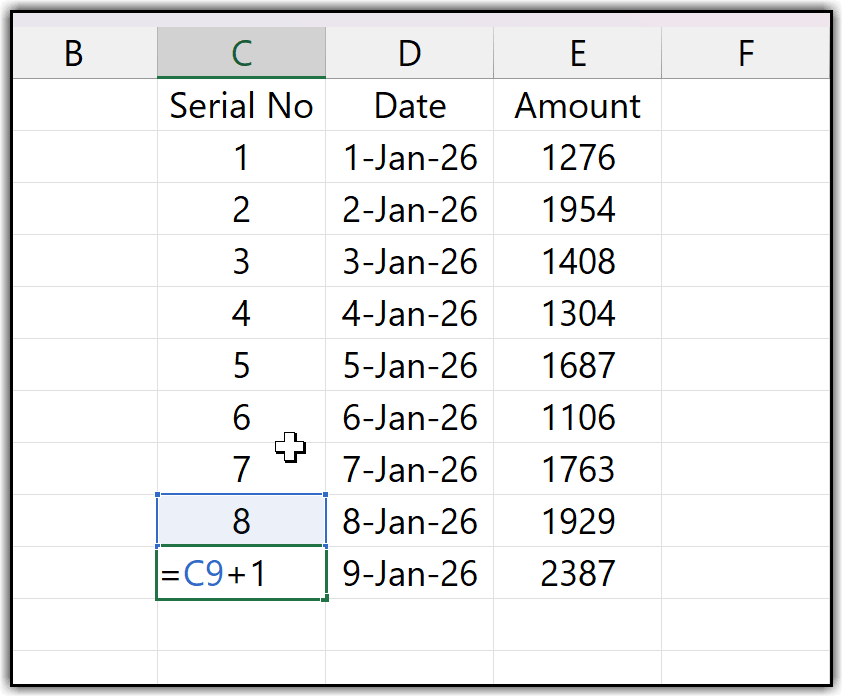 Now I have an Excel table with three columns: Serial Number, Date, and Amount. From this point on, whenever I add a new entry, let’s say I enter the next date, 10 Jan 2026, the moment I press Enter, Excel automatically adds the next serial number, which is 9, without needing to drag the formula down.