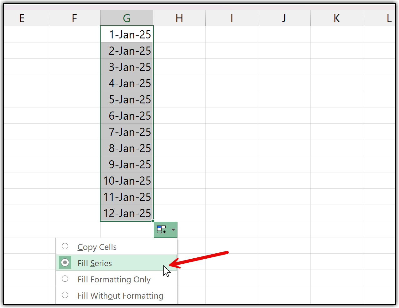 When you click on this drop-down, you’ll see a few additional options. From there, select Fill Series. The moment you choose this option, all the repeated 1s in the range are converted into a sequence of numbers, which become your serial numbers. We’ll cover the Fill Series option in more detail in a later method.