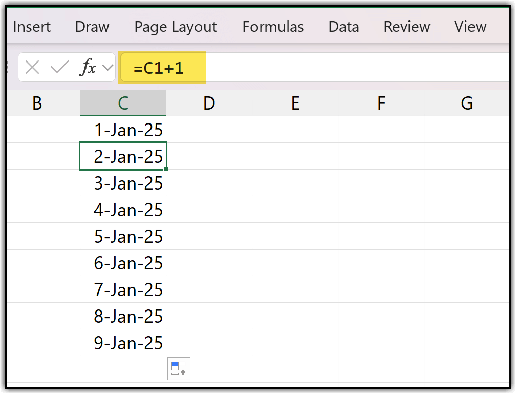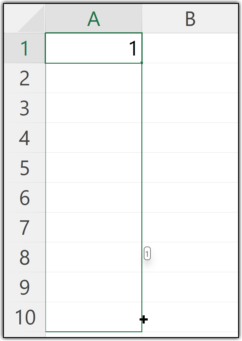 When you do this, you won’t get serial numbers immediately, instead, you’ll see the value 1 repeated in all the selected cells. After dragging, you’ll notice a small drop-down at the end of the range called Auto Fill Options.