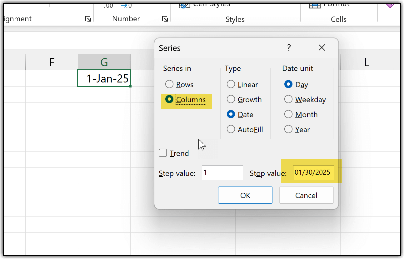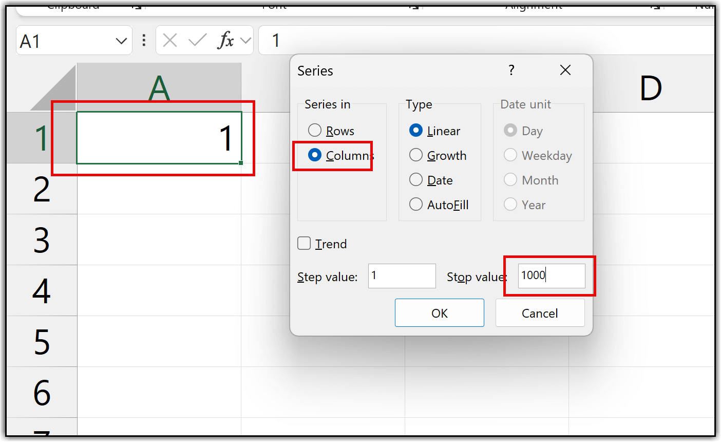This opens a small dialog box with a few options to choose from. From the Series in section, select the Columns option. In the Step value field, you can change the increment if needed, but here we’ll keep it as 1. In the Stop value field, enter the maximum serial number you want. For instance, if you want serial numbers from 1 to 1000, enter 1000.