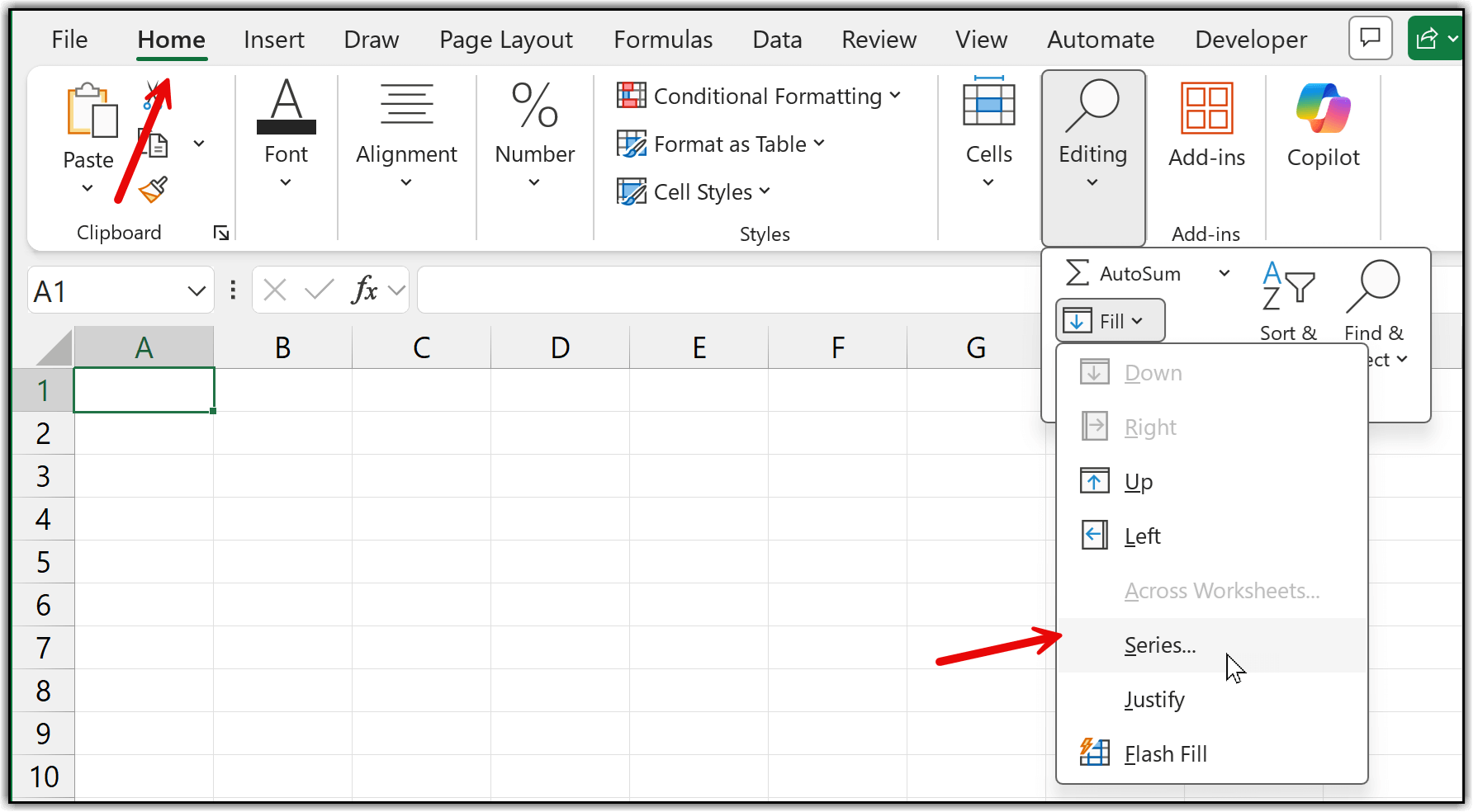 After that, go to the Home tab again, open the Fill drop-down, and select the Series option.
