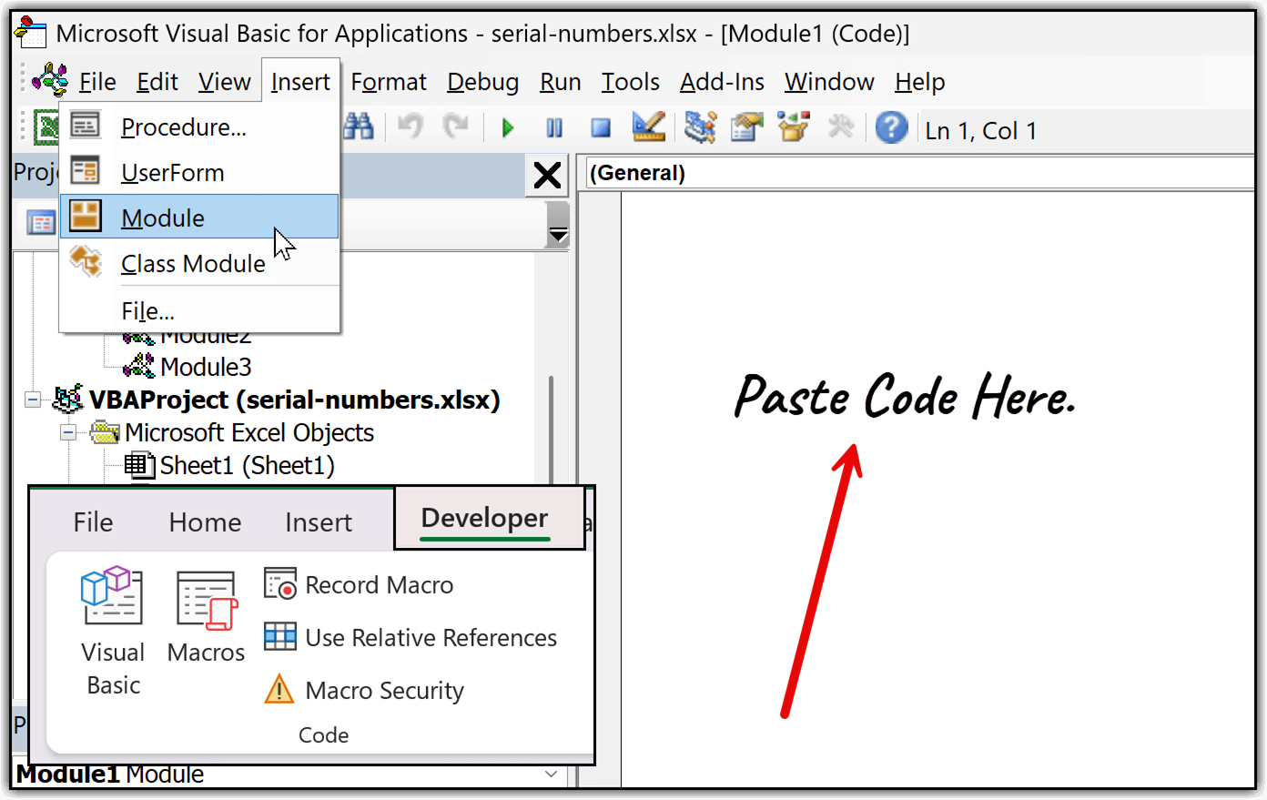 Steps: Developer Tab > Visual Basic > Insert > Module > Paste the Code into the Code Window.