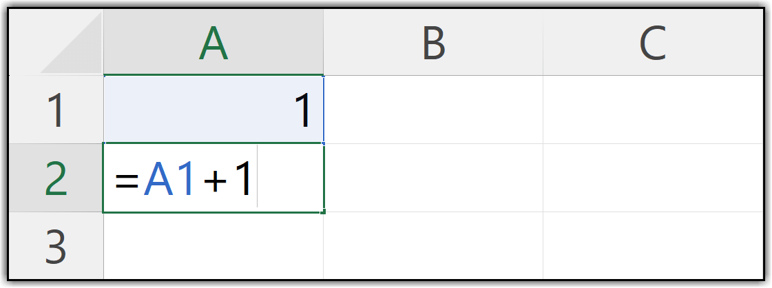 All you need to do is select the first cell from where you want to start your serial numbers and enter 1 in that cell. When you press Enter, the active cell moves down to the next cell. In this second cell, enter a simple formula that refers to the cell above where you entered 1. In my case, that cell is A2, and then add 1 to it using the addition operator. When you press Enter, you’ll see 2 in the second cell.
