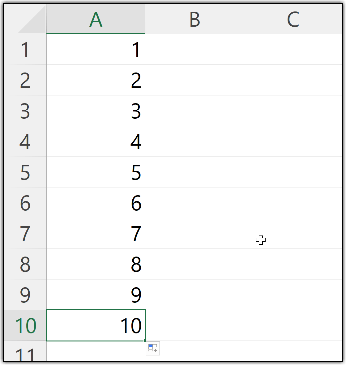 After that, use the fill handle to drag this formula down to the number of cells where you want serial numbers. For example, if you want 10 serial numbers, simply drag the formula down until the last cell shows 10.