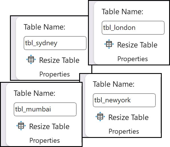 For example: tbl_sydney / tbl_newyork / tbl_mumbai / tbl_london