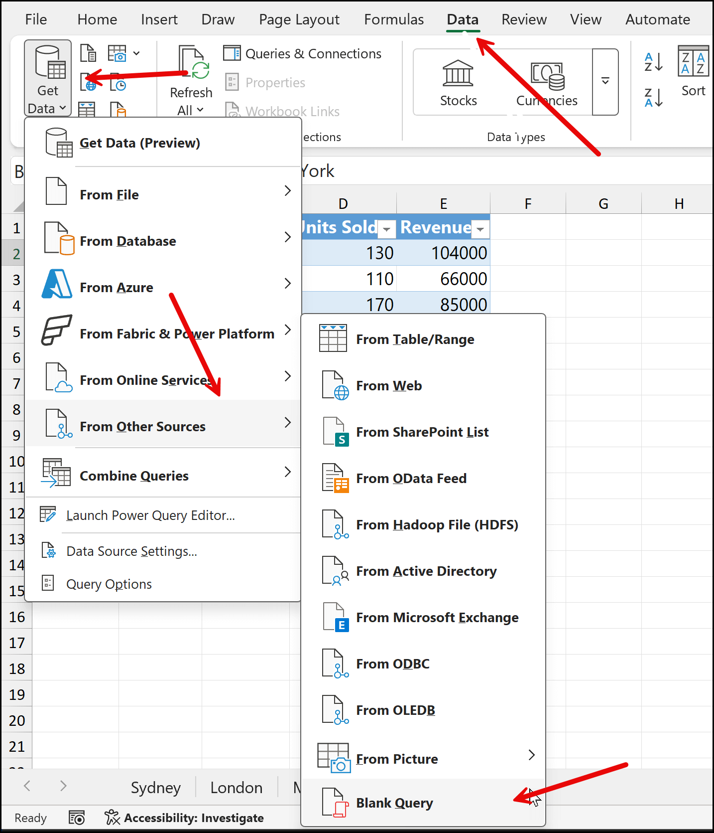 First, go to the Data tab, and in the Get & Transform Data group, click Get Data. Then go to From Other Sources.