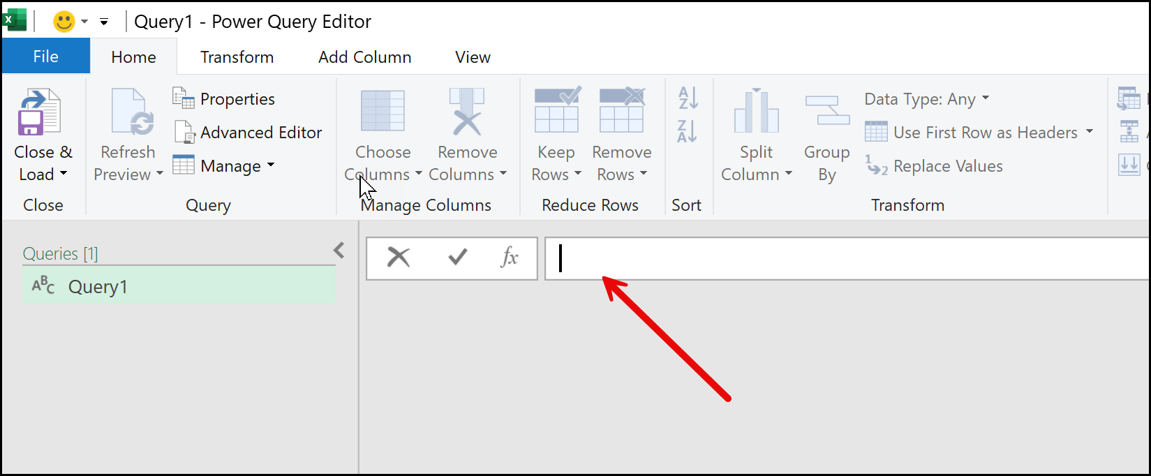 Now you have the Power Query Editor open with a blank query, and you’ll see a blinking cursor in the formula bar. This is where we are going to write a function that will pull data from all the tables in the current workbook.