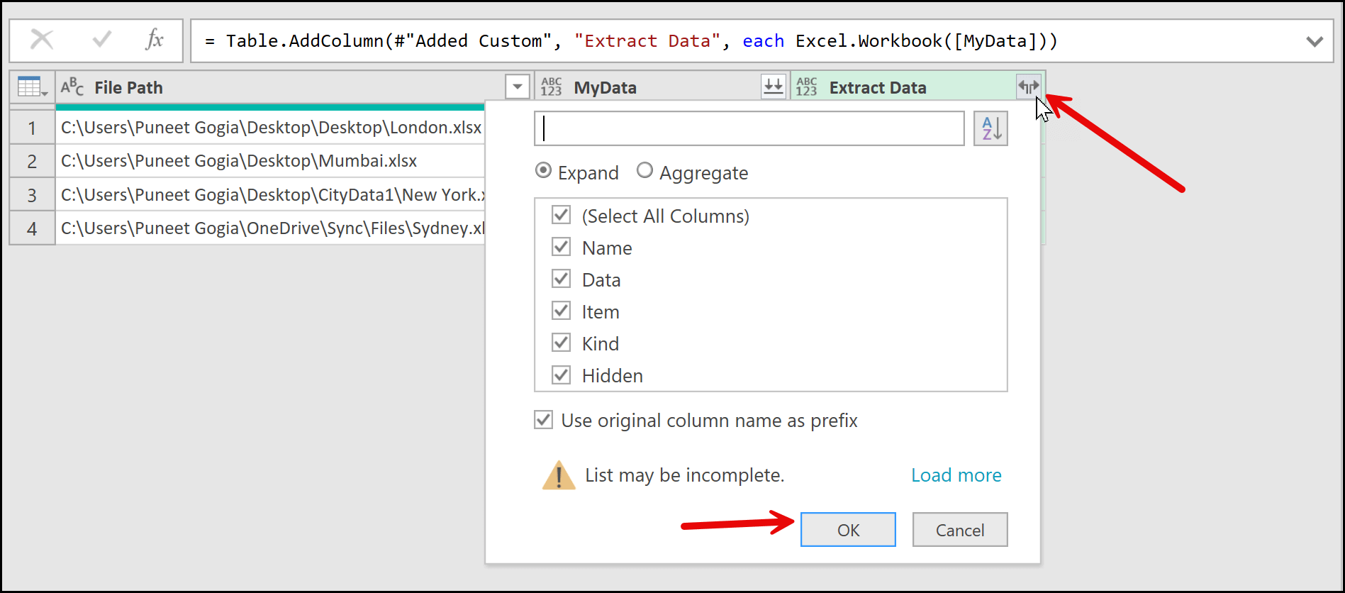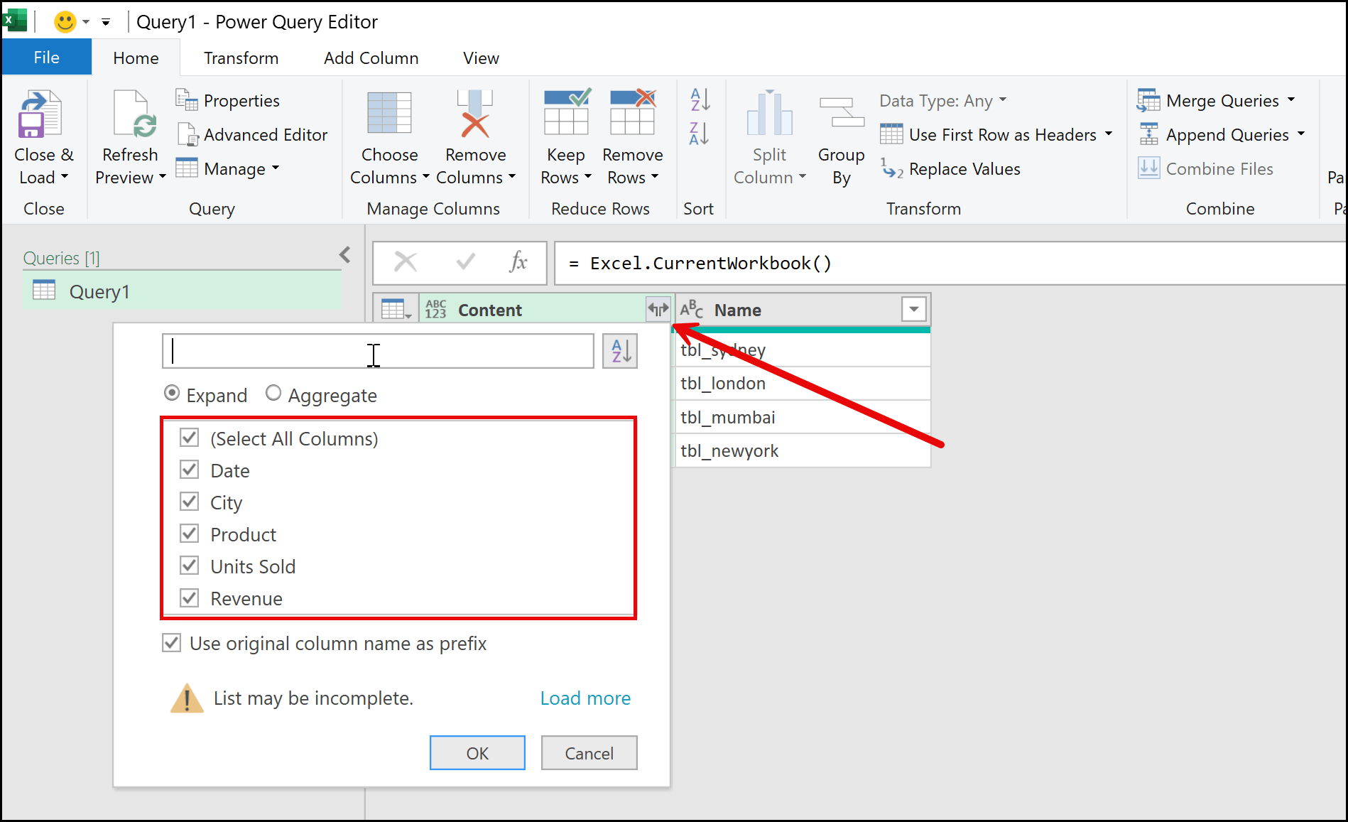 Once you click the expand (filter) button, you will see all the columns from all the tables that we loaded from the four worksheets. Then simply click OK, and Power Query will expand this single cell into the full combined data from all four tables.