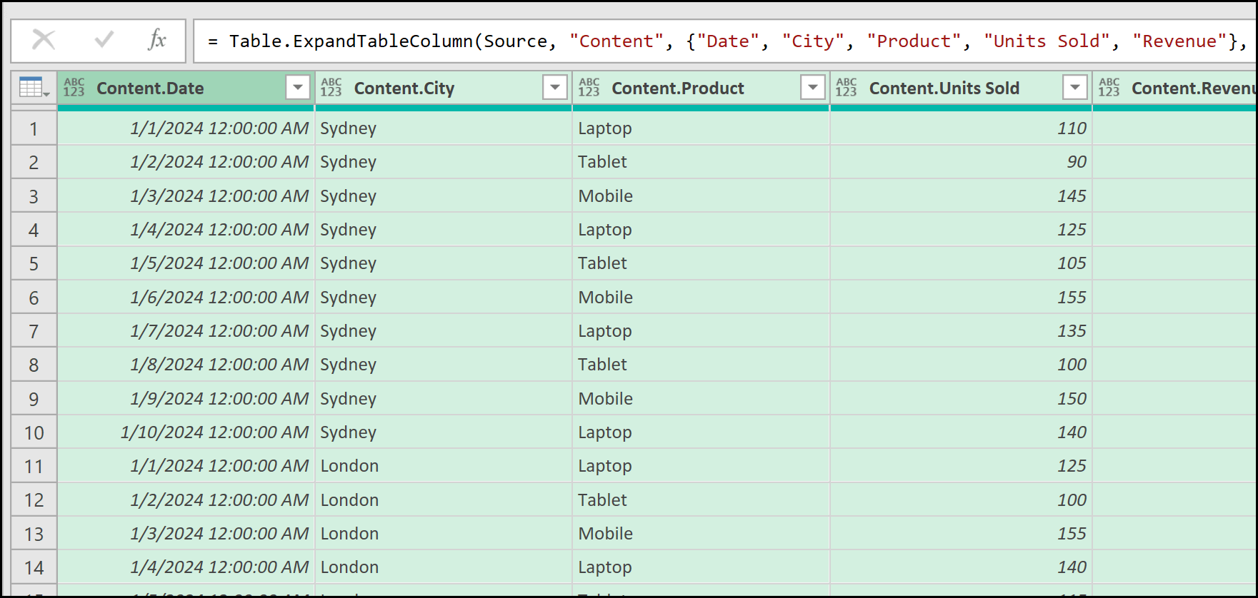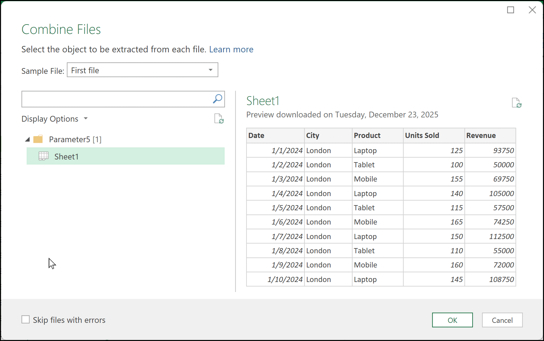 When you click on it, Power Query will take a few seconds to process the data. In the parameter options, select Sheet1 (or the relevant sheet name), and then proceed. After evaluating the query, you’ll see the combined data appear in the Power Query Editor, including columns such as Date, City, Product, Units Sold, and Revenue, pulled from all four files stored in different locations.