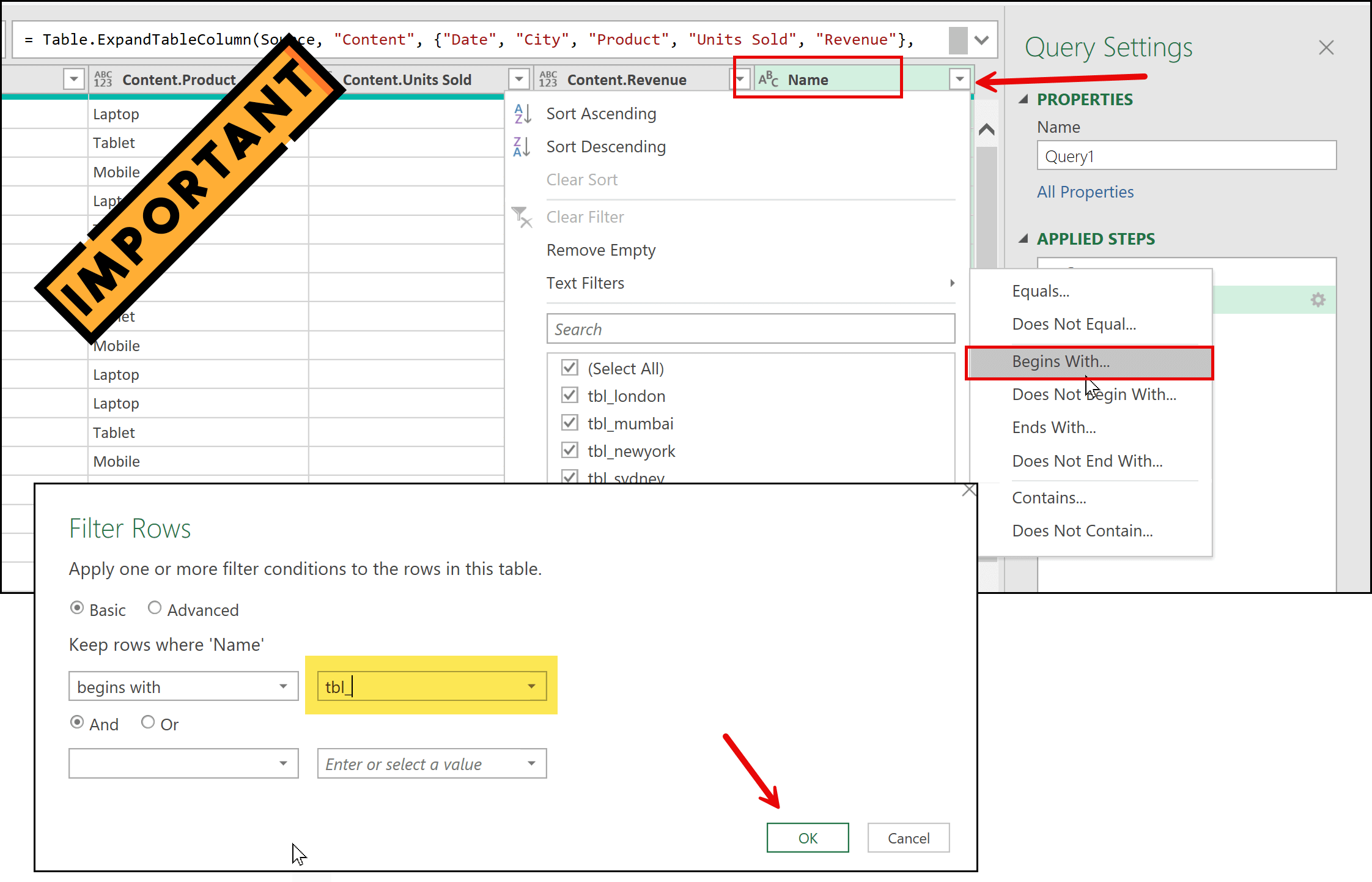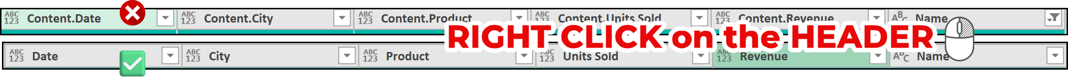 You need to rename all the columns. You’ll notice that each column starts with the word “Content.”, followed by the actual column name. That’s why it’s important to rename the columns. You can rename them one by one, and Power Query will add a single step for this change.
