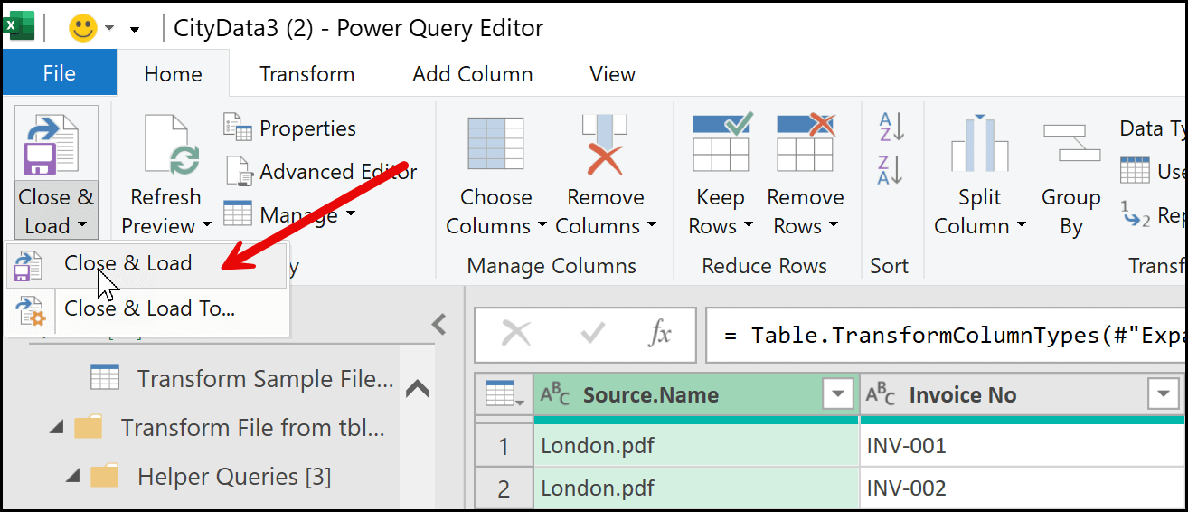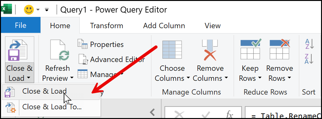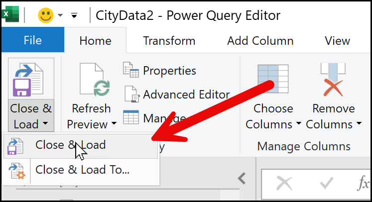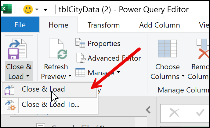 Next, go to the Home tab and click on the Close & Load drop-down, or you can directly click on the Close & Load button. I recommend using the Close & Load option.