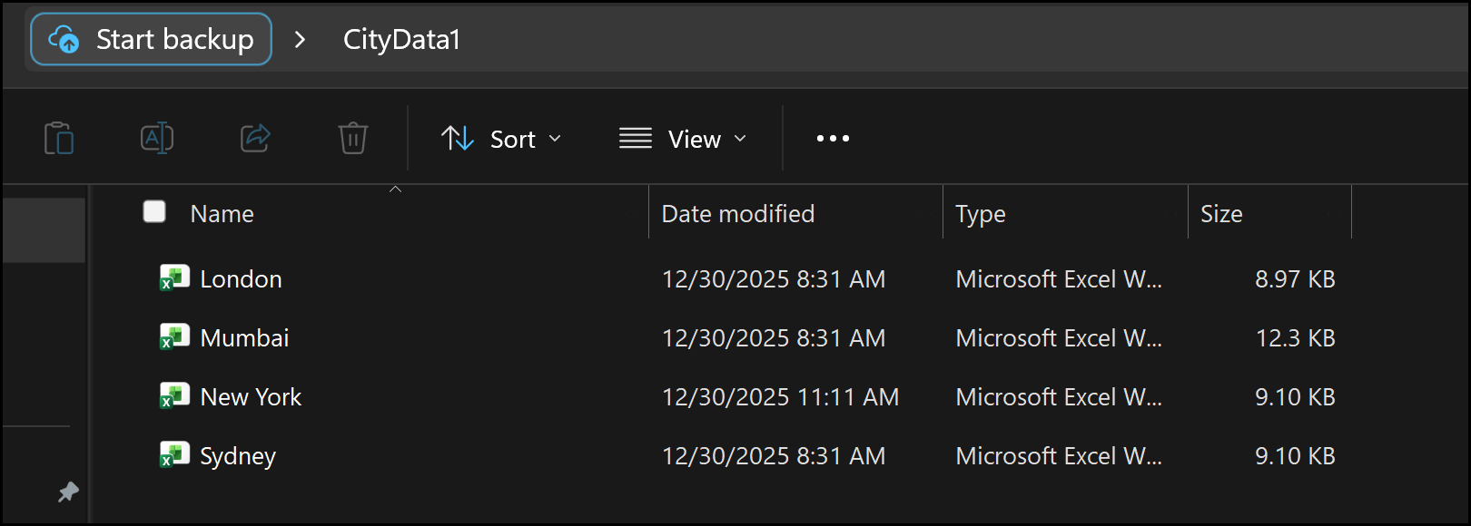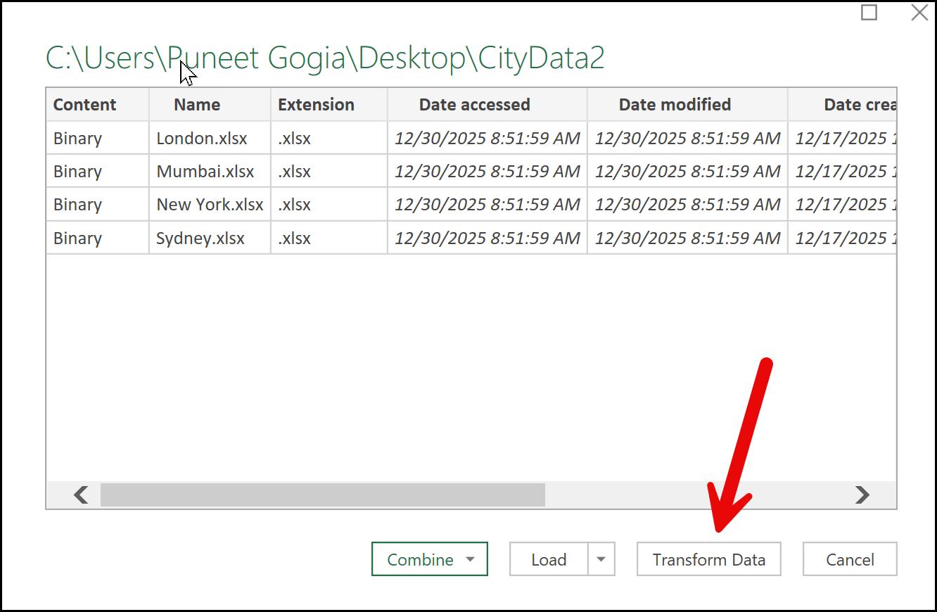 In this window, you’ll also see three buttons: Combine, Load, and Transform Data. Since we still haven’t accessed the actual data from the files, London, Mumbai, New York, and Sydney, we don’t want to load or transform anything yet. This is where the Combine button comes in. It’s specifically designed for situations like this, where a folder contains multiple files rather than raw data.