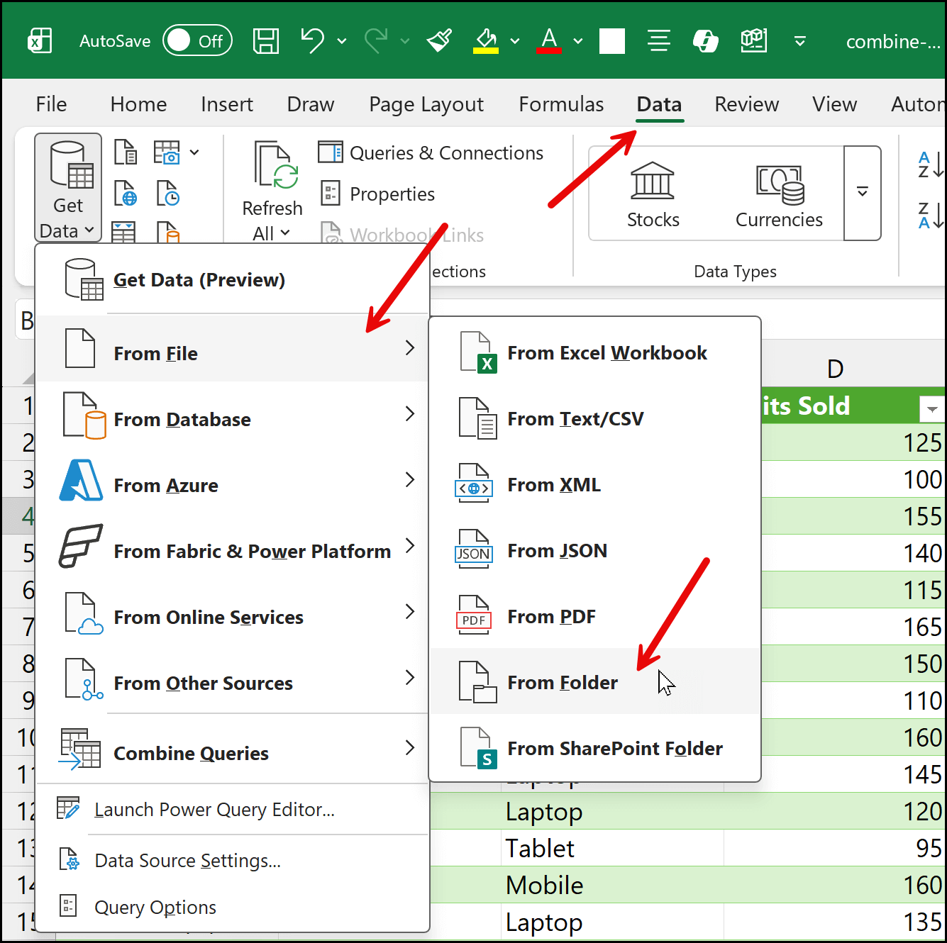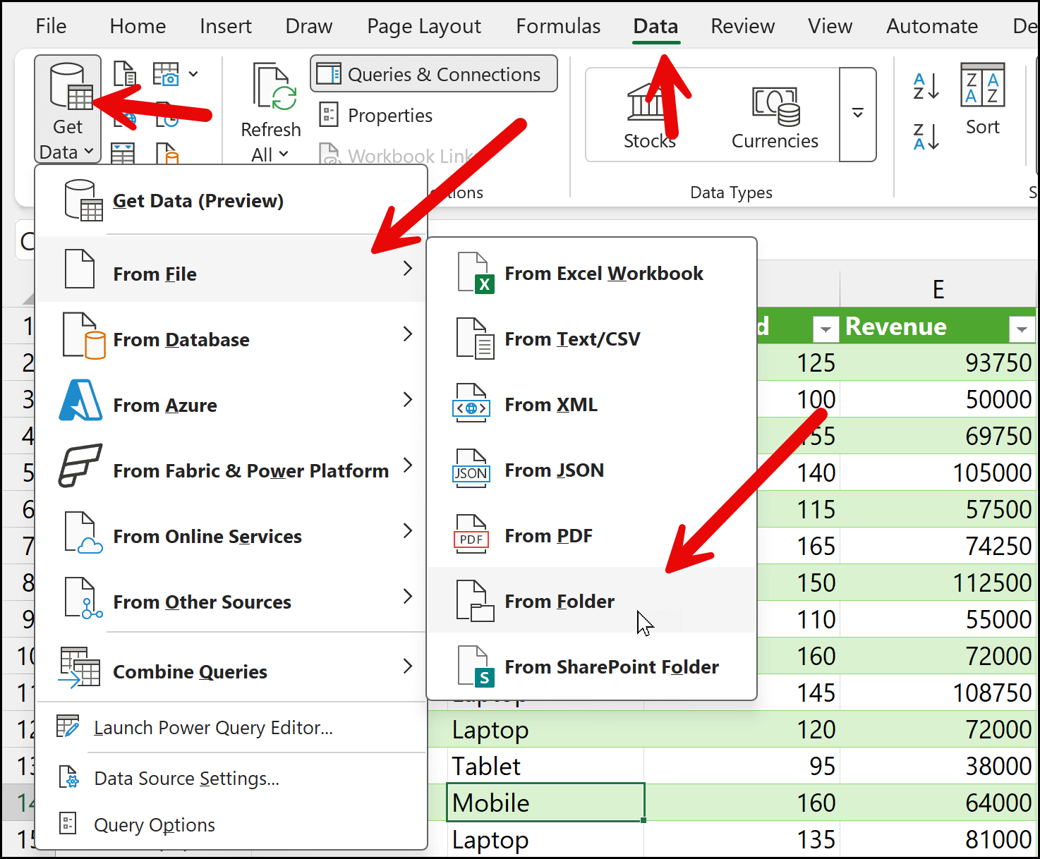 Next, go to the Data tab. From there, click the Get Data drop-down, then choose From File. You’ll see a list of options, and near the end of that list, select From Folder.