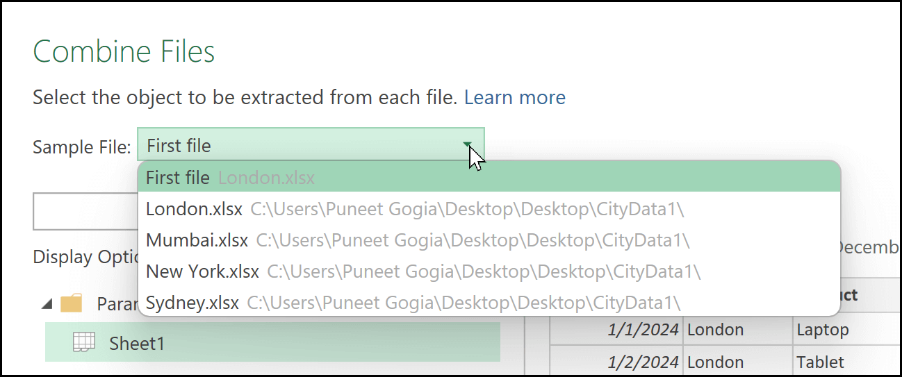 You can also see the Sample File drop-down, where you can select a file if you want to preview data from a different file. When you click on this drop-down, you can see all four files available in the folder, London, Mumbai, New York, and Sydney.