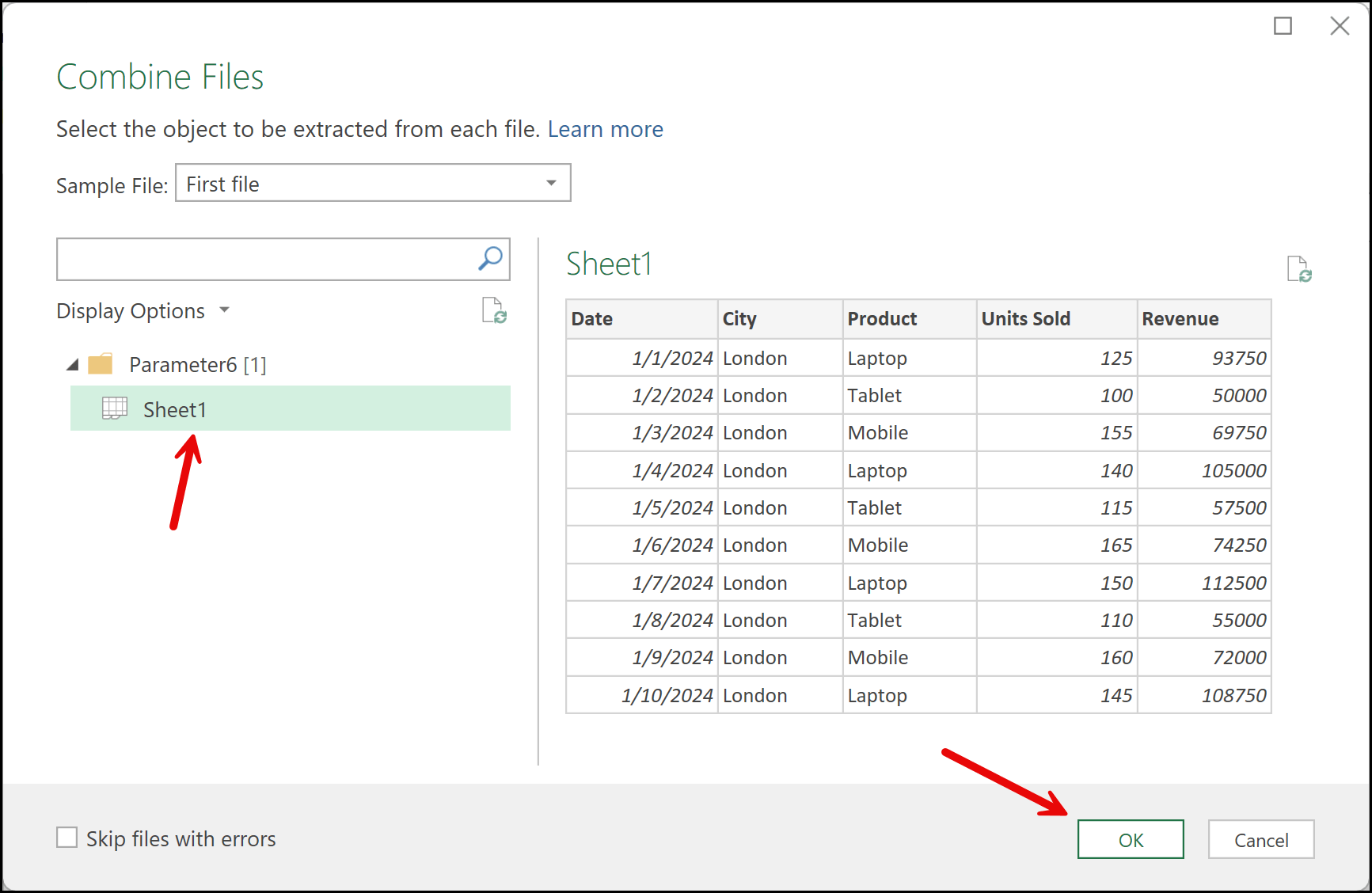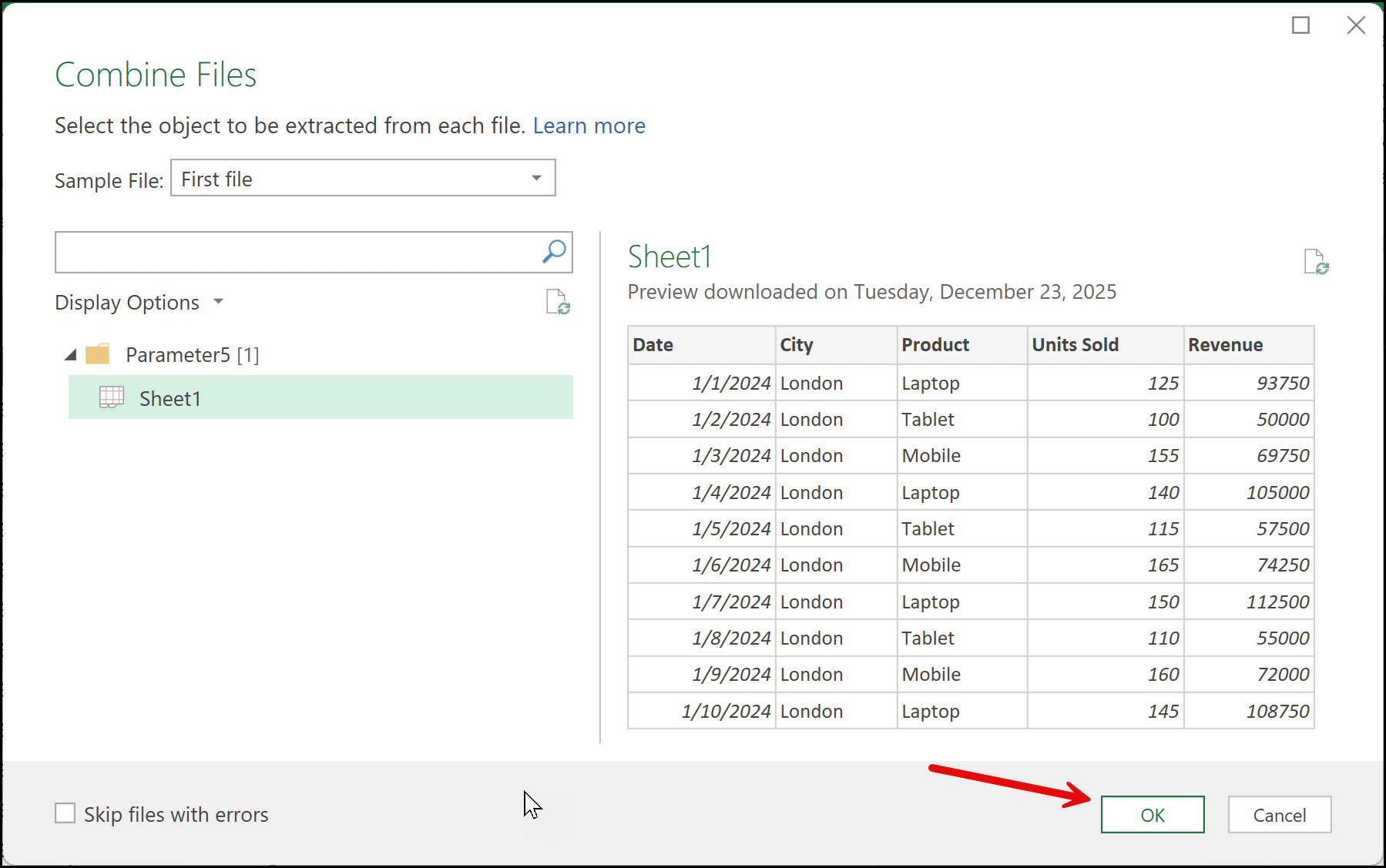 After you are done with the preview and are confident that the data looks correct for combining, select the First File again from the Sample File drop-down, choose the sheet name, and then click the OK button to proceed.