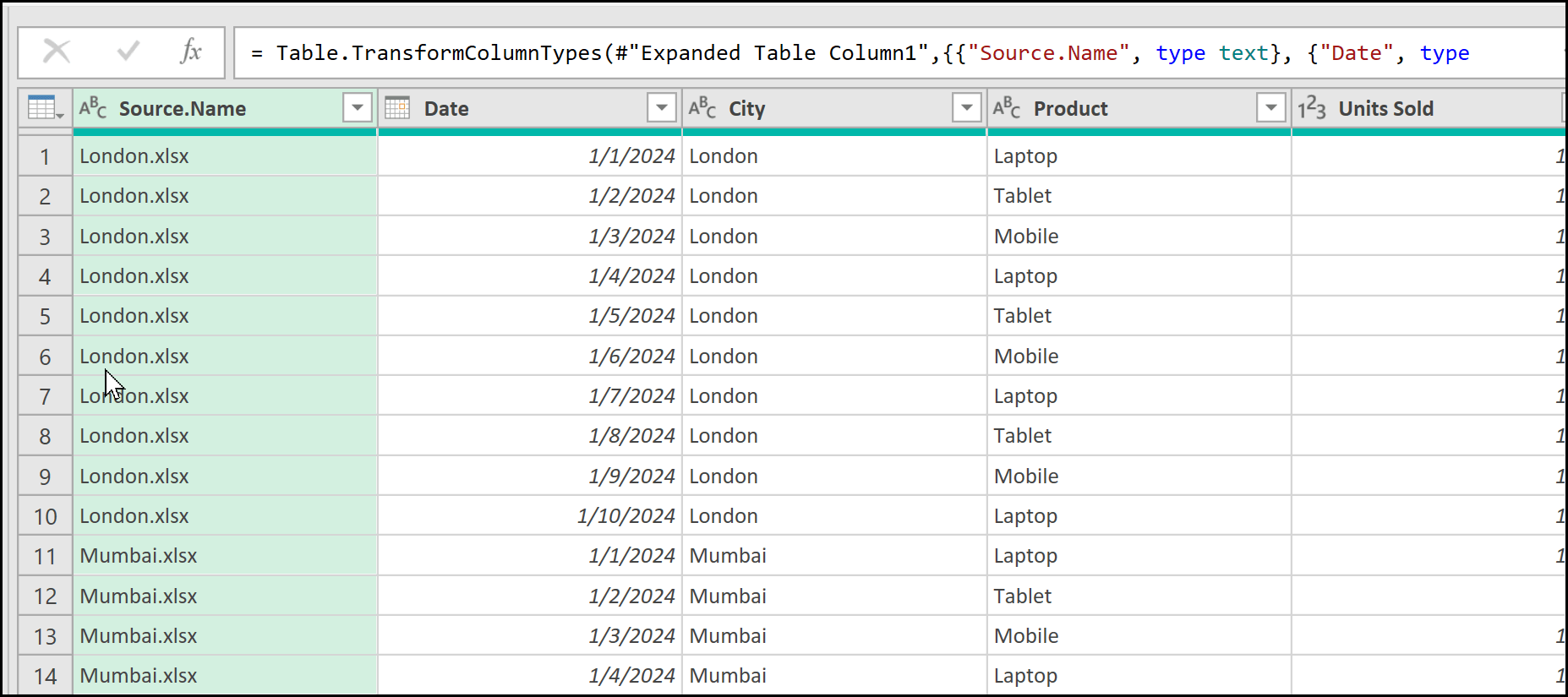 Along with this data, which has a total of five columns, there is one additional column at the beginning called Source.Name. This column represents the names of the files from which the data is being combined.