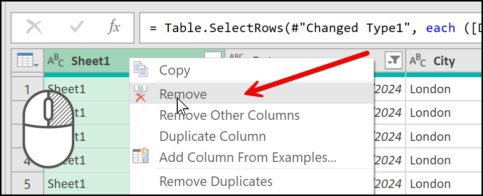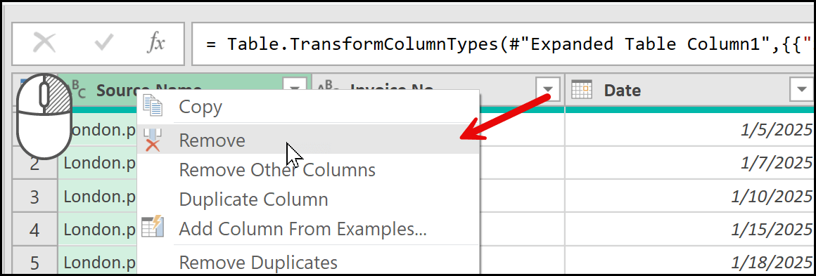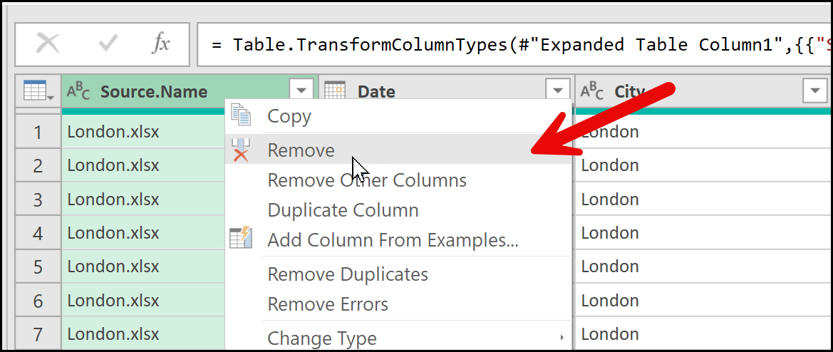 Now, the next thing I’m going to do is delete the Source.Name column, because I don’t need the name of the workbook in my data. I already have a column that shows the city name, so keeping the Source.Name column would create duplication in the data. To do this, I’ll select the column, right-click on it, and then click on the Remove option. This will instantly remove the column from the data.