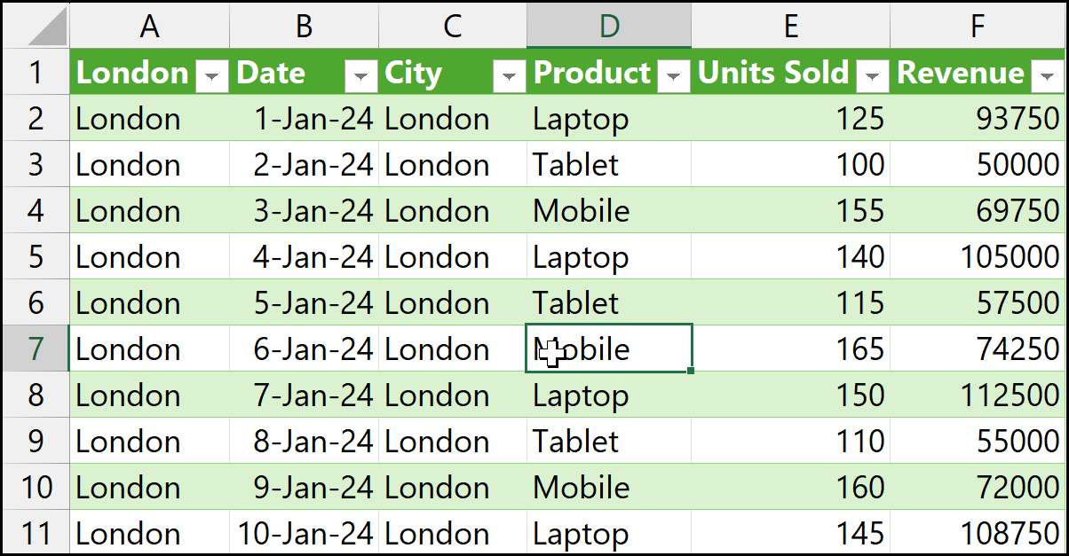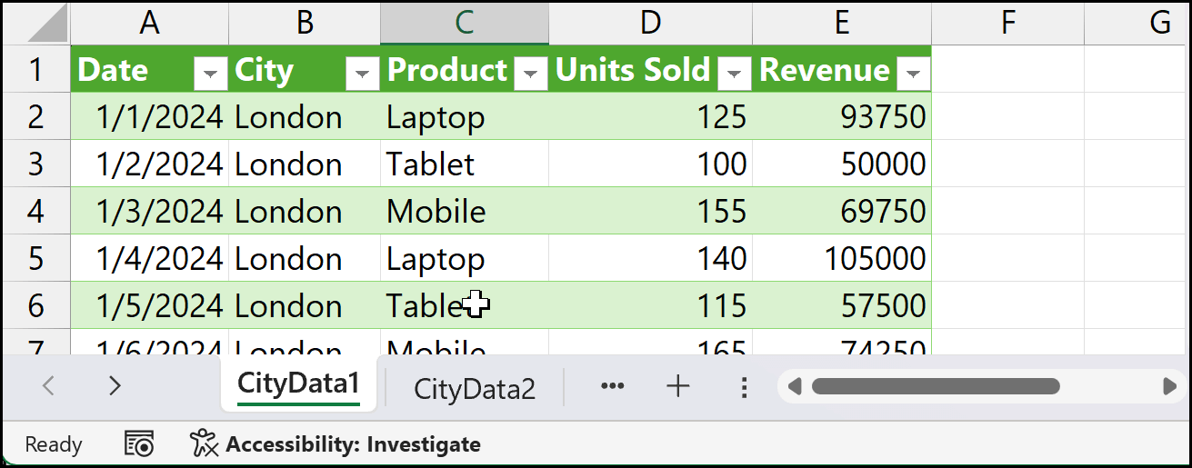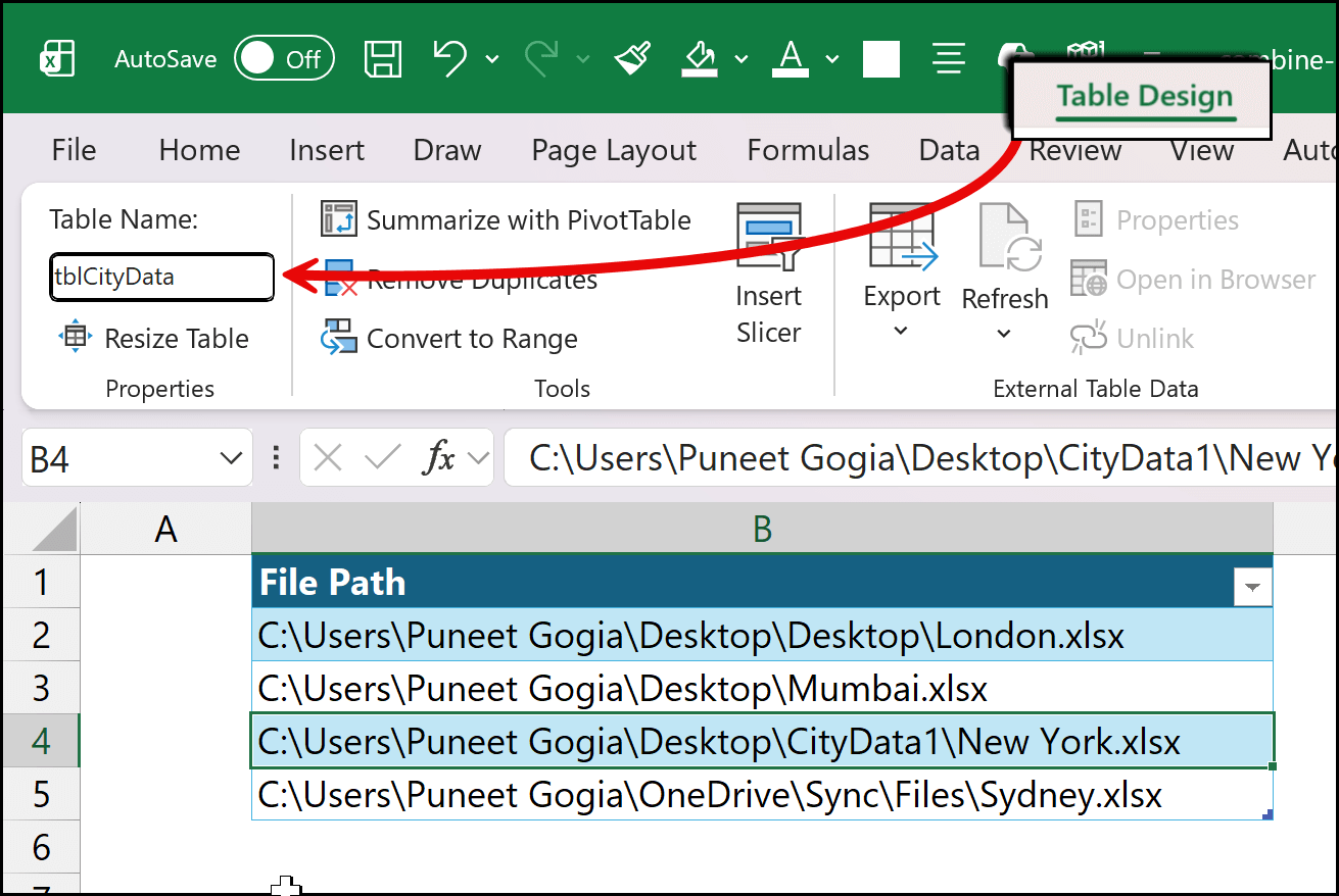 Whenever you create an Excel Table, you should give it a meaningful name. In this example, since we have data for different cities, we’ll use the city name as the table name.