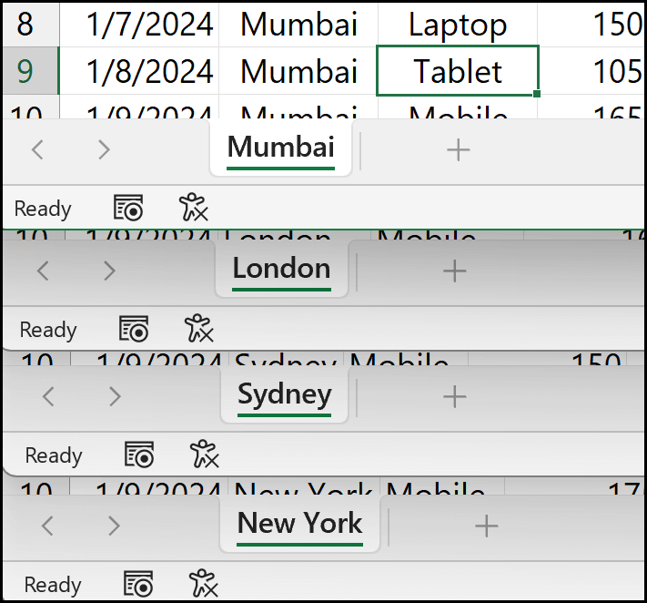 If you look at the data in the example below, I have data from four different cities, like, Sydney, New York, Mumbai, and London. Now I want to bring the data from all four worksheets into a single worksheet in the same workbook.