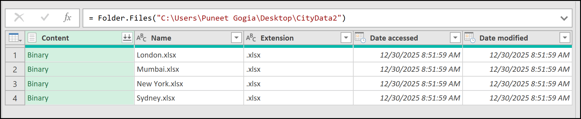 Now, there is one important thing you need to understand about the entire query we just created using Power Query. All the files we used from the folder have the same worksheet name. In other words, all four files containing data from the four cities use an identical worksheet name.
