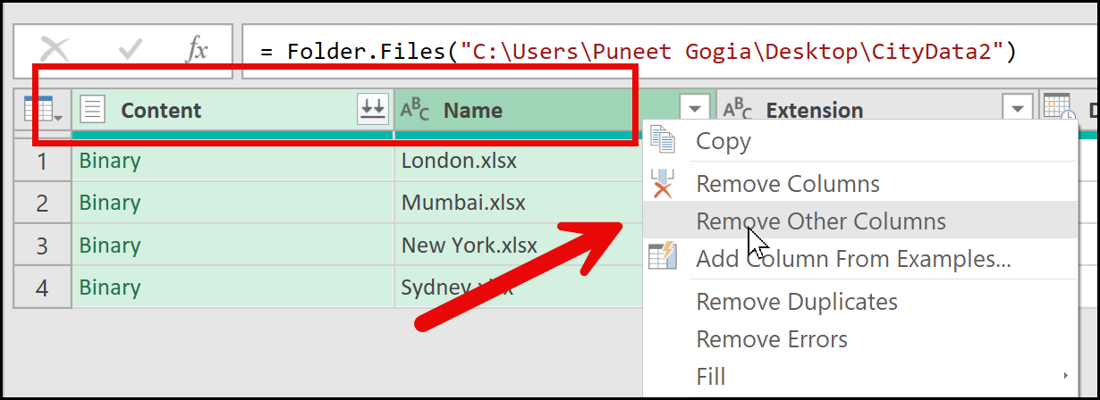 From here, there is one important step required to access the data from all the files. I’ll select the Content and Name columns, right-click, and then click on Remove Other Columns. This means I’m keeping only these two columns and removing all the remaining ones.