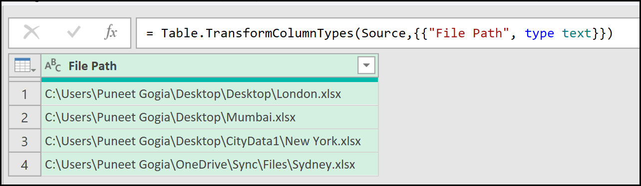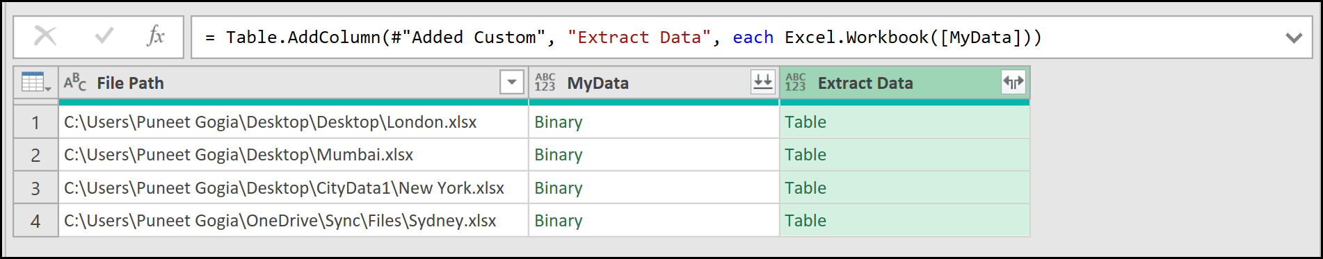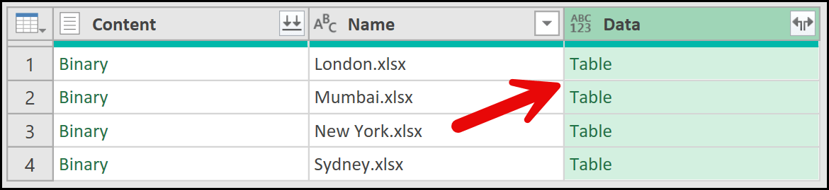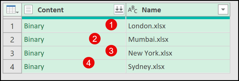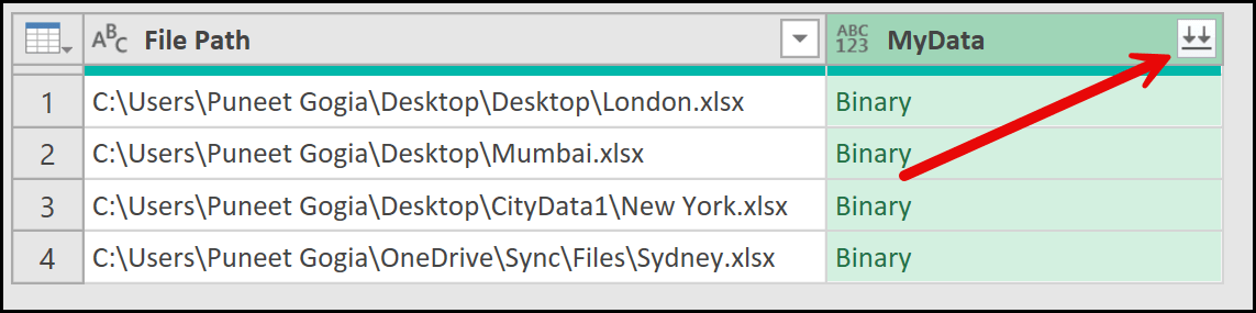 When you hover over this icon, you’ll notice a tooltip that says Combine Files, which confirms that Power Query has successfully read data from all the files listed in the File Path column.