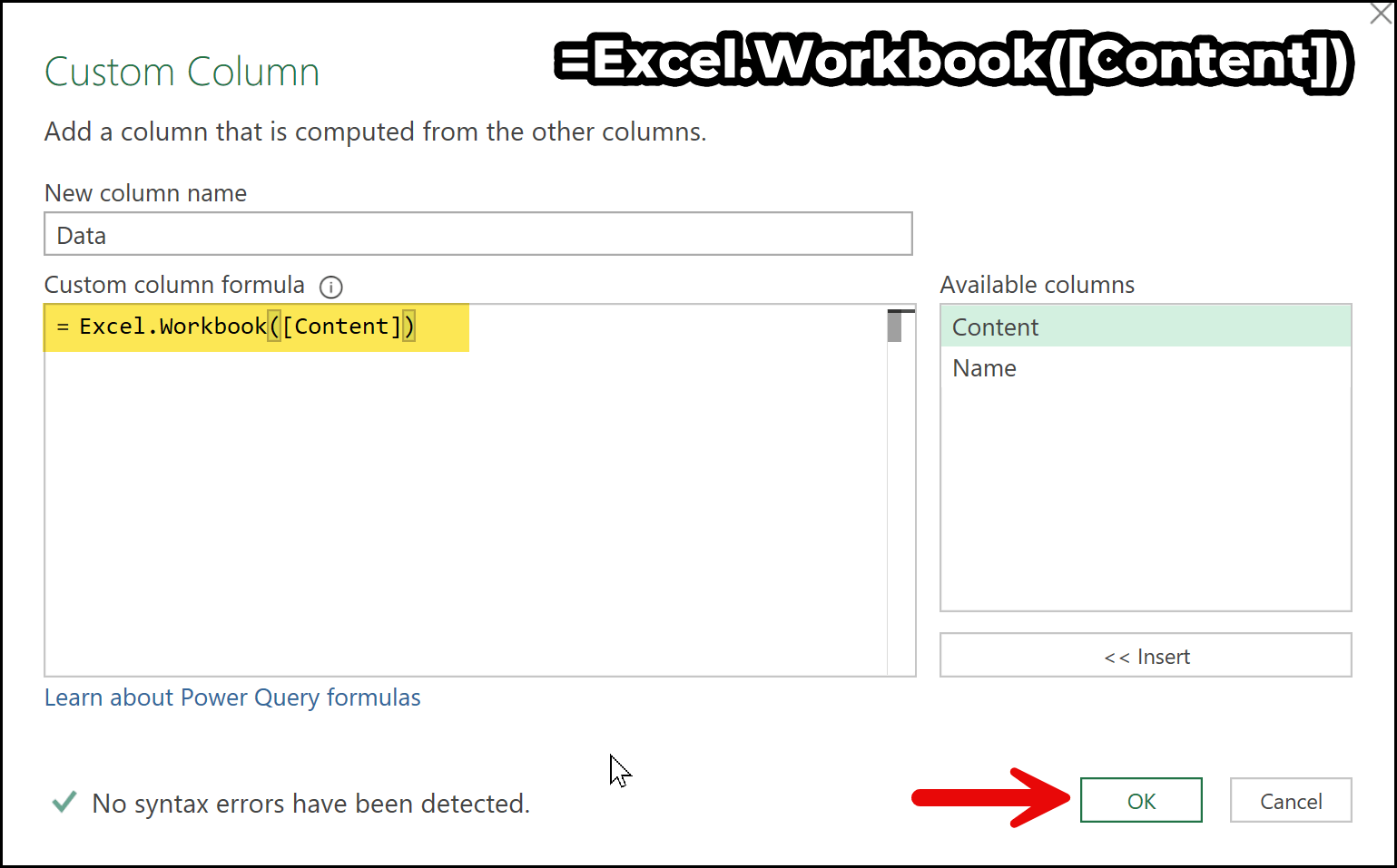 Then, I’ll add the closing parenthesis to complete the formula. So, the final formula is Excel.Workbook([Content]).