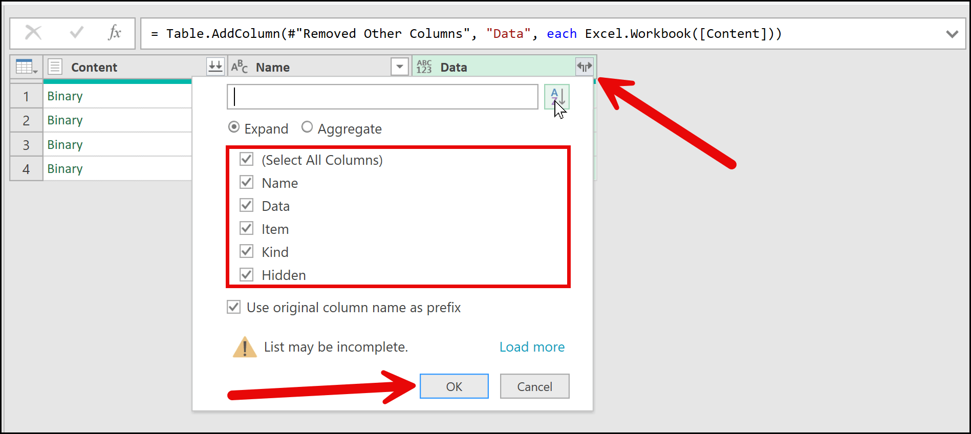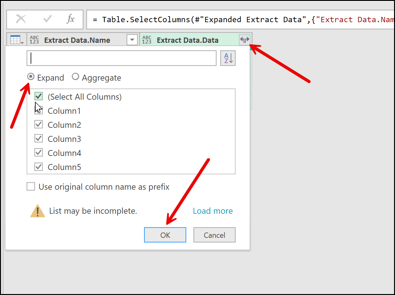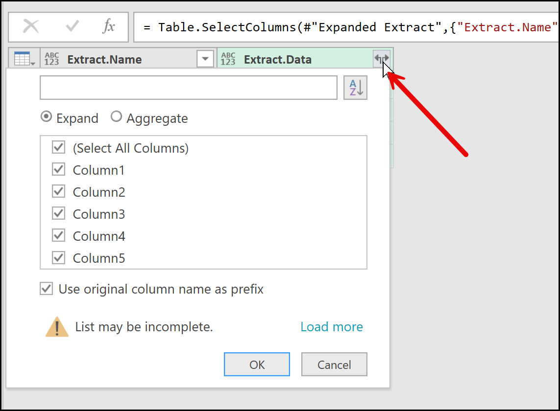 As soon as I open this filter, you can see the columns that exist inside this column. Since this is the Data column, I’ll simply click OK, and this will expand the table.