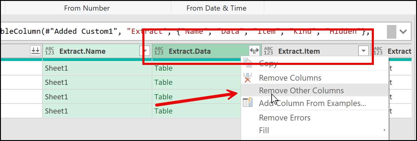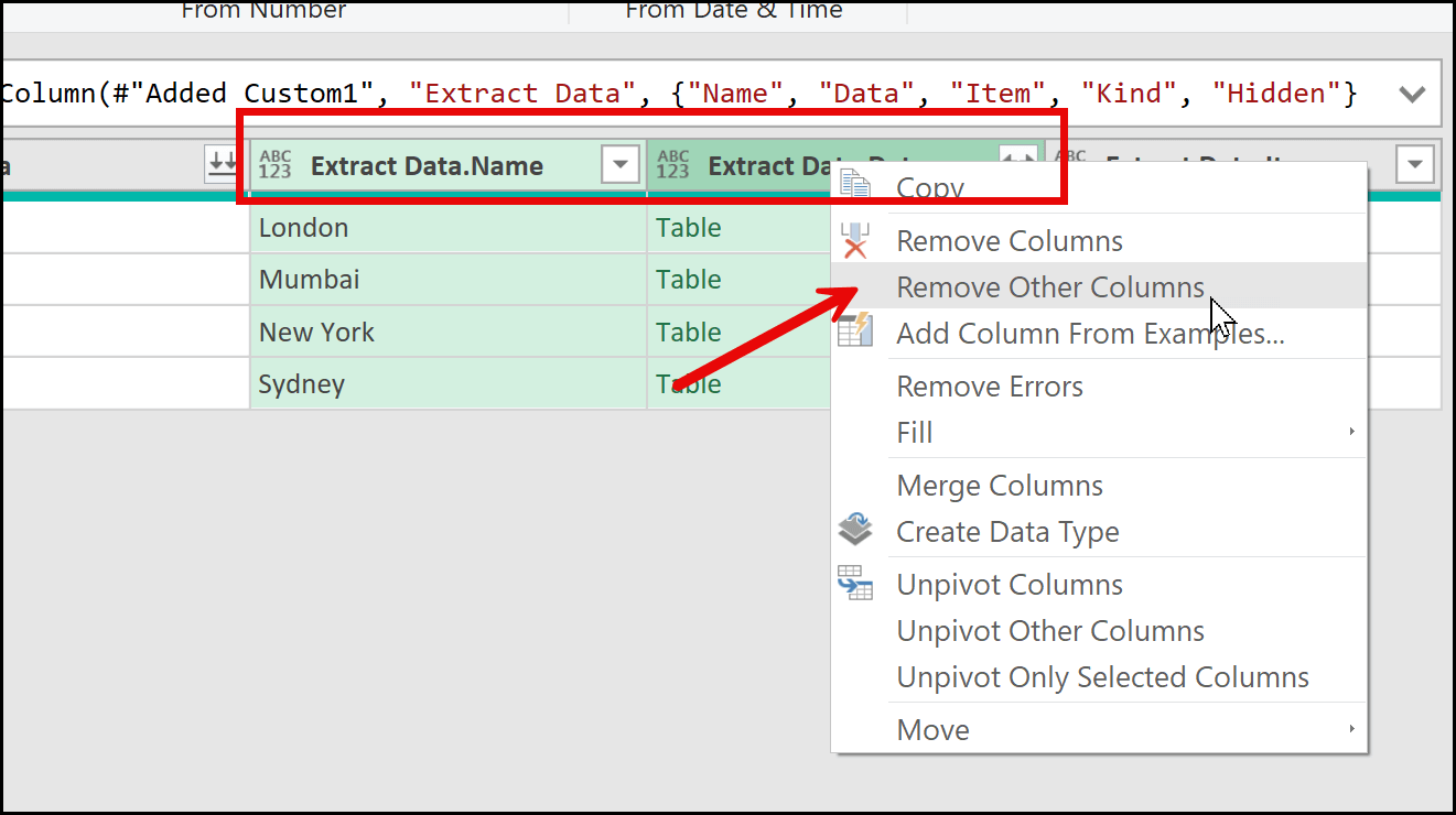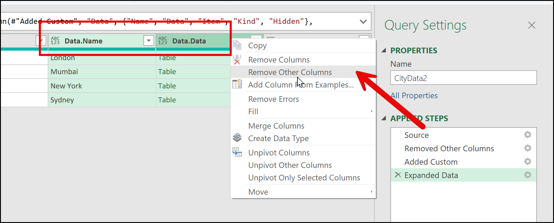 Now, you can see multiple columns in the Power Query Editor. From here, the next step is to select the Data.Name column and the Data.Data column. After selecting these two columns, I’ll right-click and choose Remove Other Columns.