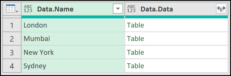Once the formula is ready, I’ll click on OK. Now you can see a new column named Data, and it contains four entries, each labeled as Table.