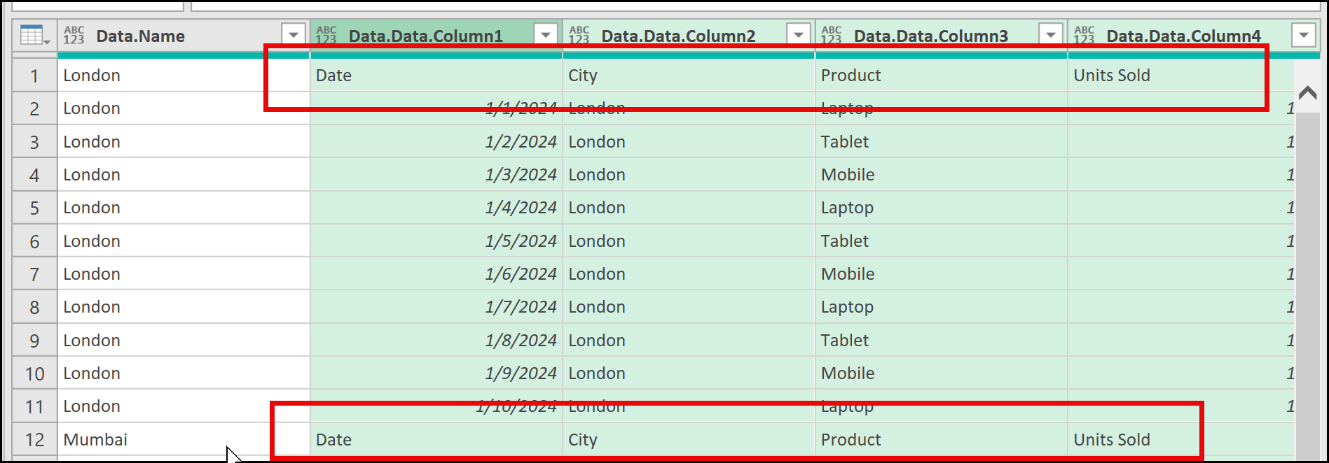 Now, there is one final touch we need to apply to this data table. You can see that the data is already combined, but the column headings are not correct yet. To fix this, we need to perform two simple steps.