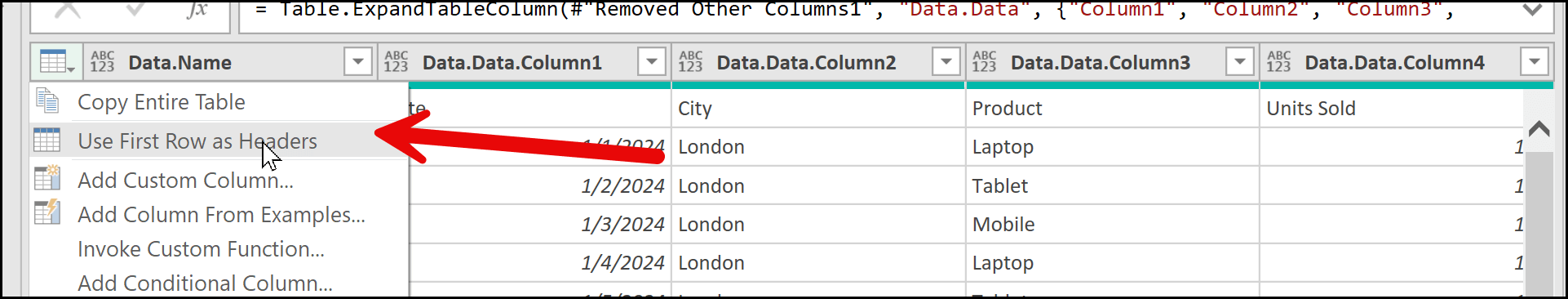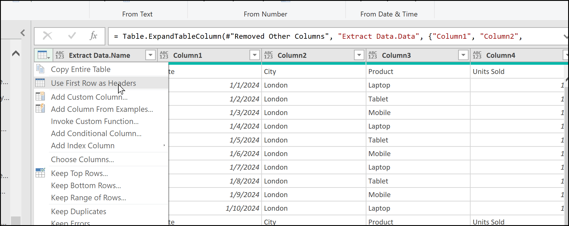 From there, select Use First Row as Headers. The moment you click this option, Power Query converts the first row into the headers of the table. Now you have meaningful column names such as Date, City, Product, Units Sold, and Revenue.