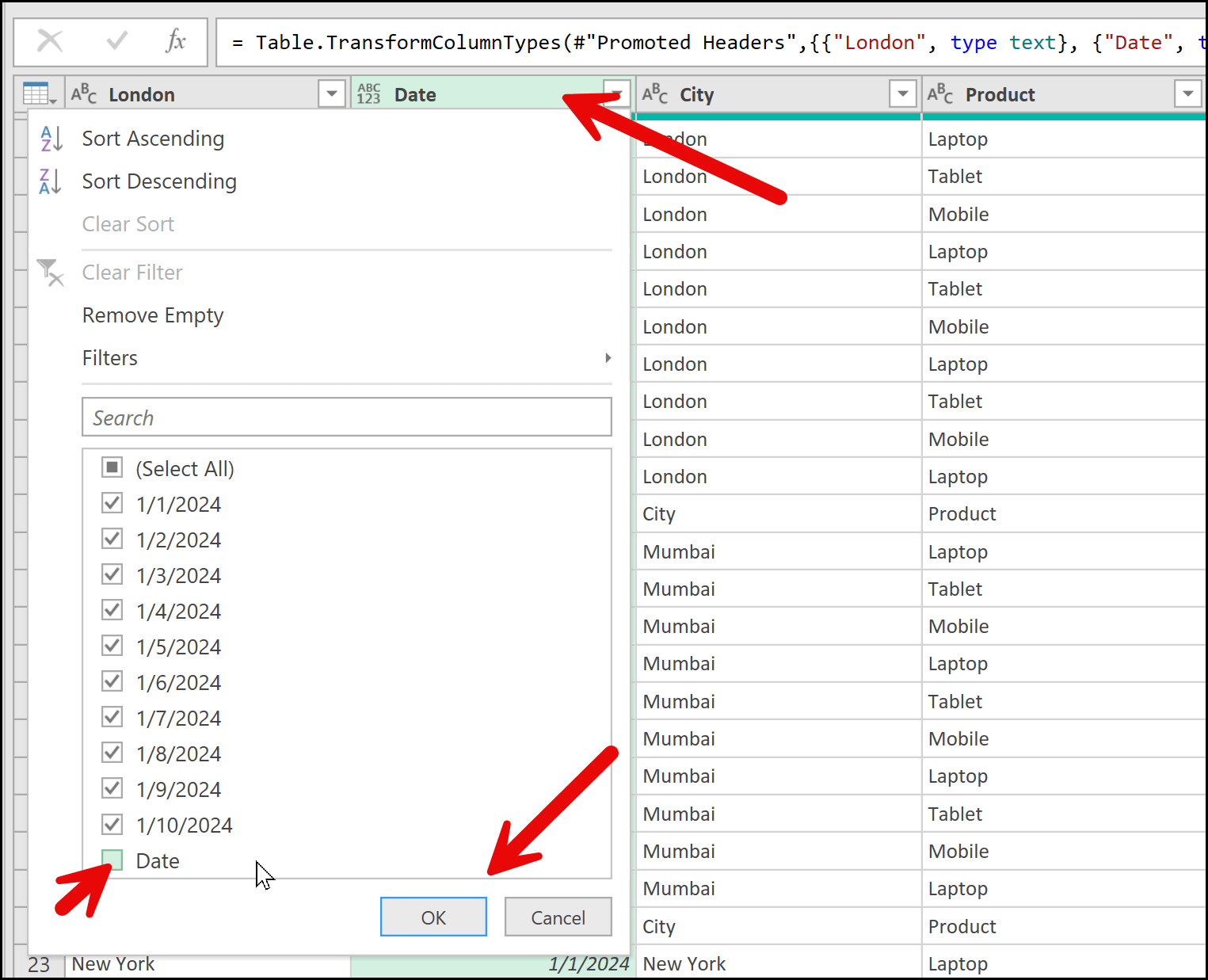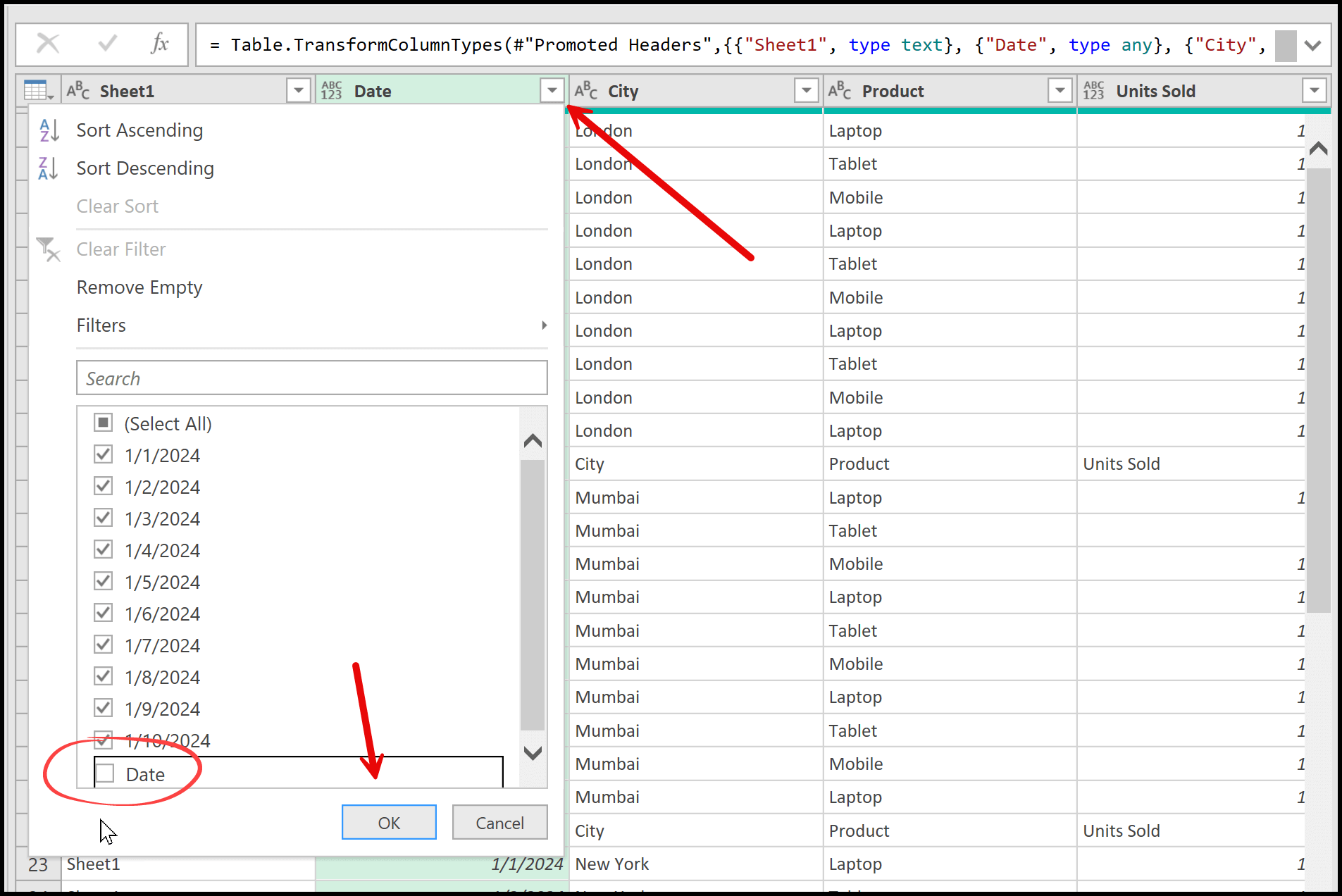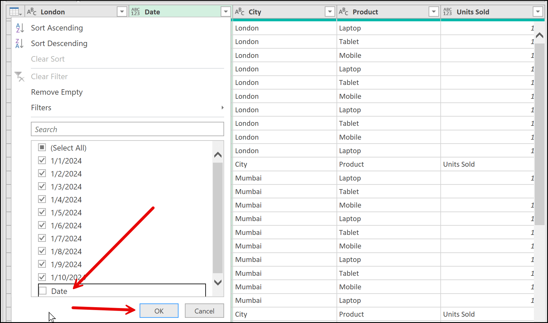 To remove these, open the filter for the Date column, uncheck the value that represents the header (such as Date), and then click OK. This filters out the extra header rows, leaving only the actual data.