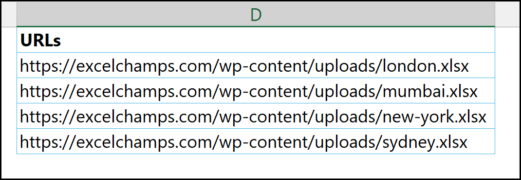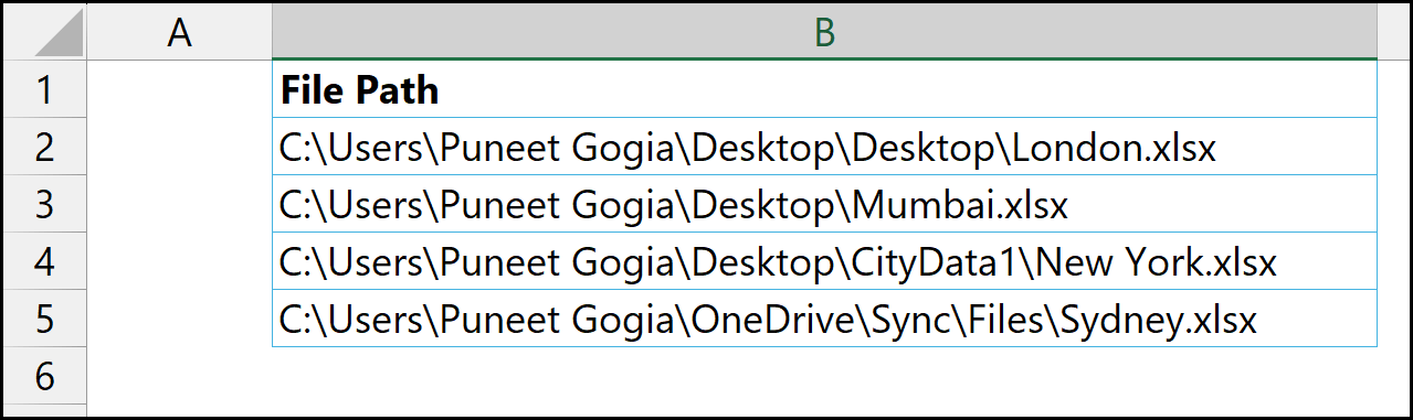 As we move forward, we’ll also see how to handle situations where the files have different worksheet names. Let’s dive in and understand the exact steps required to deal with this scenario. The first thing you need to do is collect the file paths of all the files into your Excel workbook. This is a manual step, but it’s only a one-time setup. You need to capture the path of each file individually.