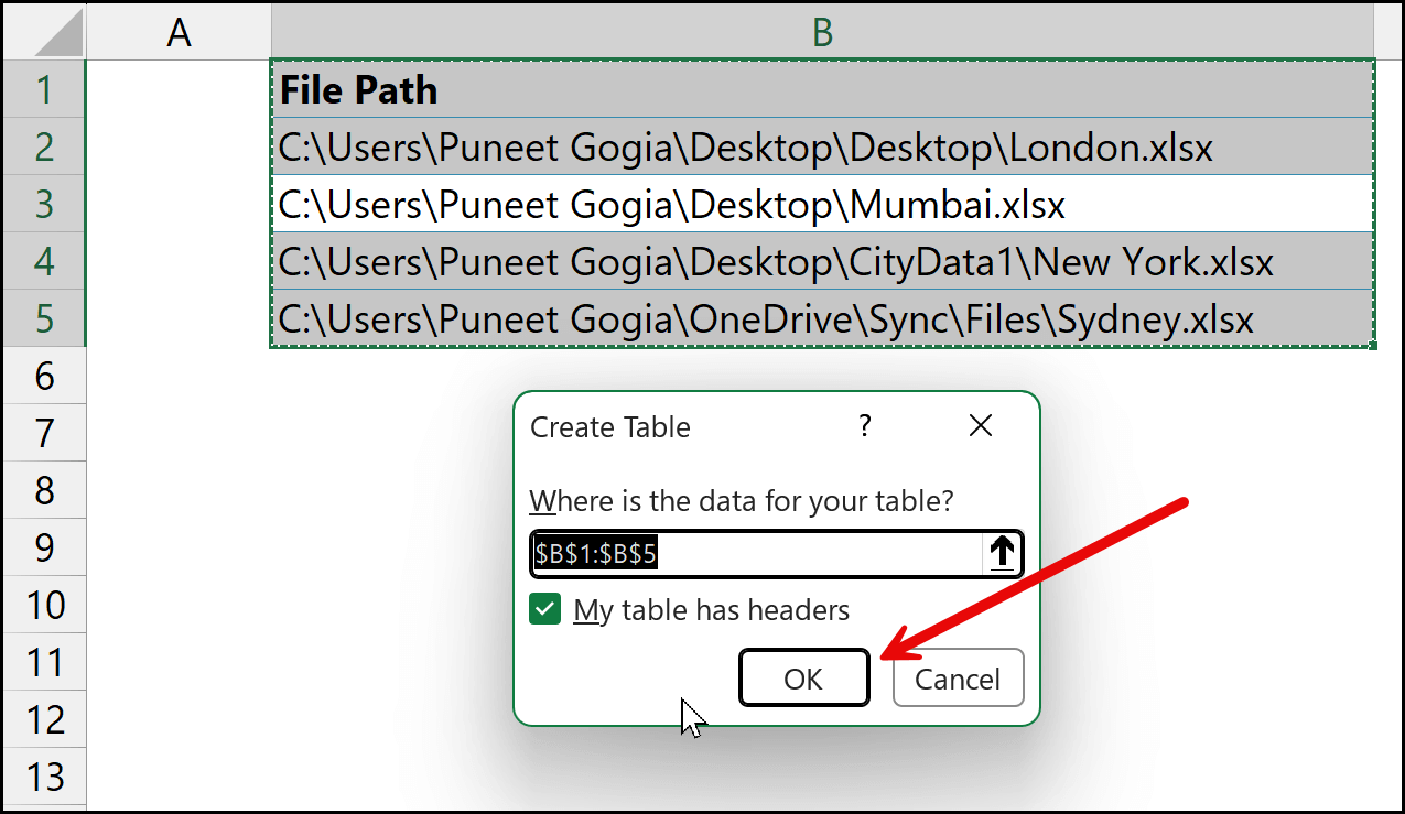 Once you do that, come back to Excel and paste the path into a cell. Repeat this process for all the files so that you have the paths listed one by one. As mentioned, this is the only manual part of the entire process. Once all the file paths are listed, give the column a header, for example, File Path.