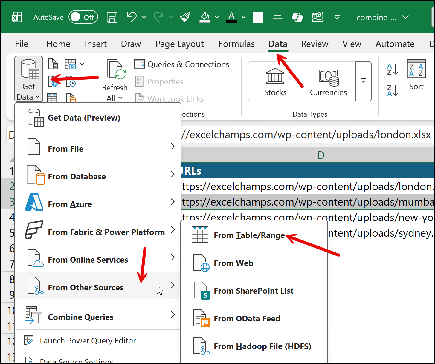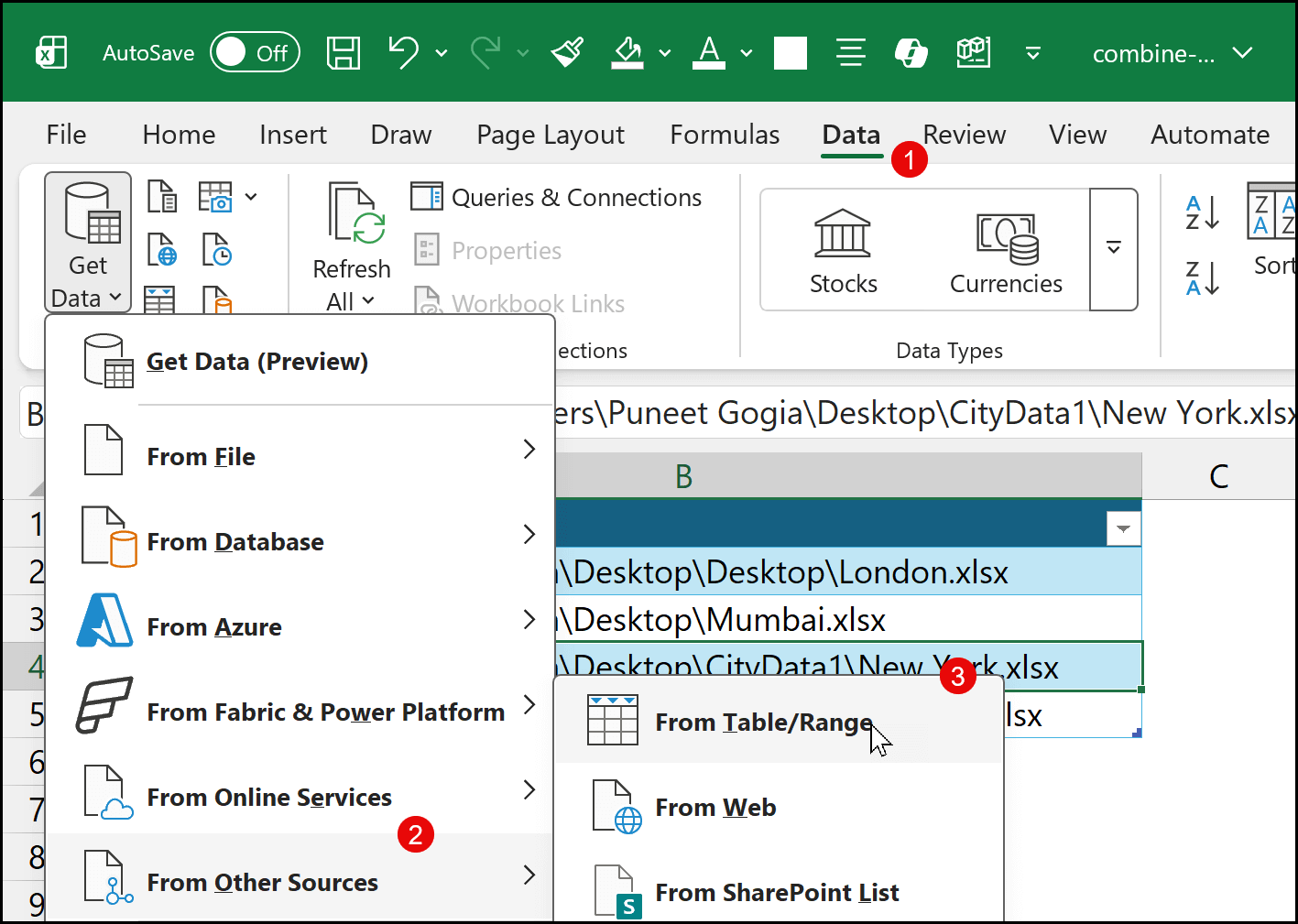 At this point, your table is ready, and you now have all the file paths stored in a structured format. Now, from here, the next step begins. We’ll go back to the Data tab and click on the Get Data drop-down. From there, we need to select From Other Sources and then click on From Table/Range.