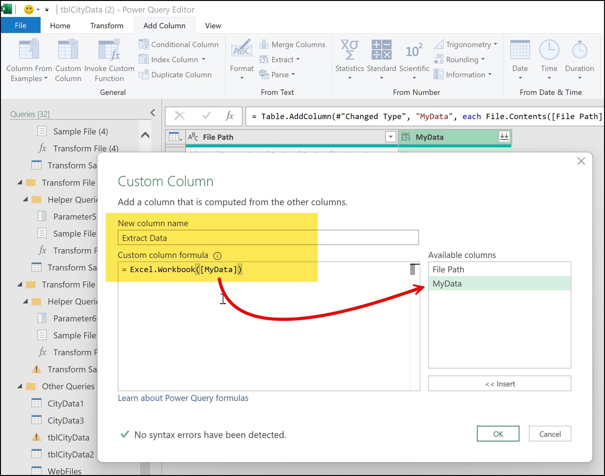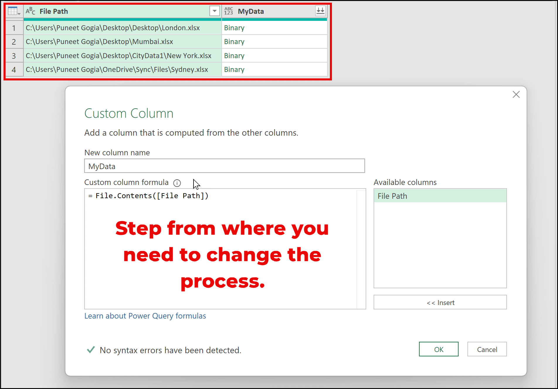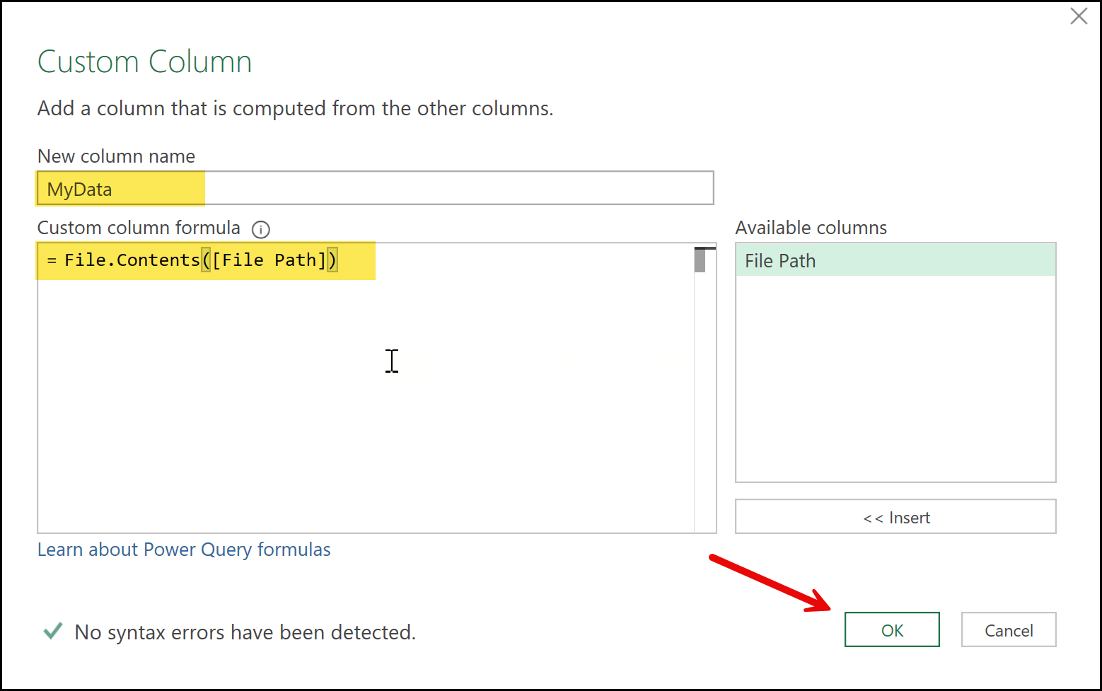 At the bottom of the dialog box, you can see a message that says No syntax error has been detected. This message is very important because it confirms that there is no issue with the formula you’ve written in Power Query.