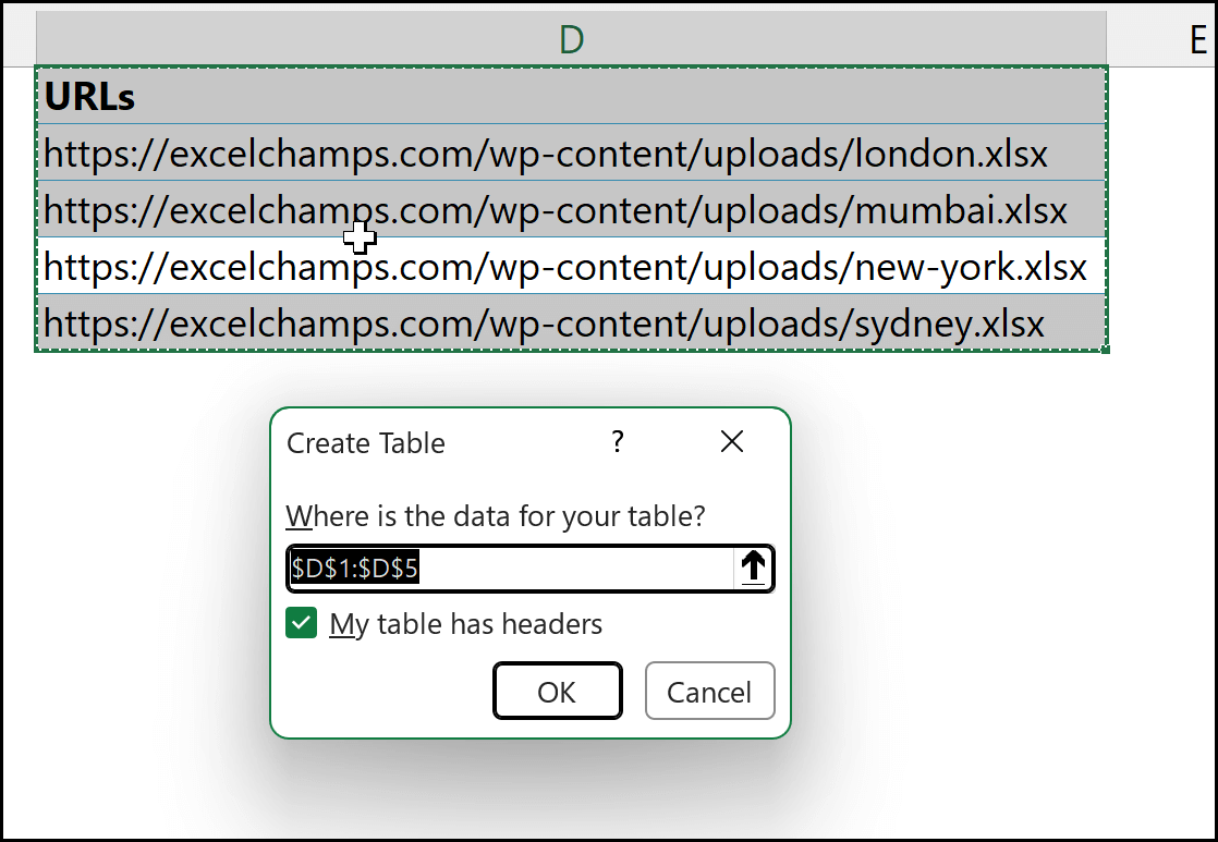 After that, convert this single-column list into an Excel table. To do this, select the list and use the keyboard shortcut Ctrl + T. Excel will ask you to confirm the table creation; click OK, and the list will be converted into an Excel table.