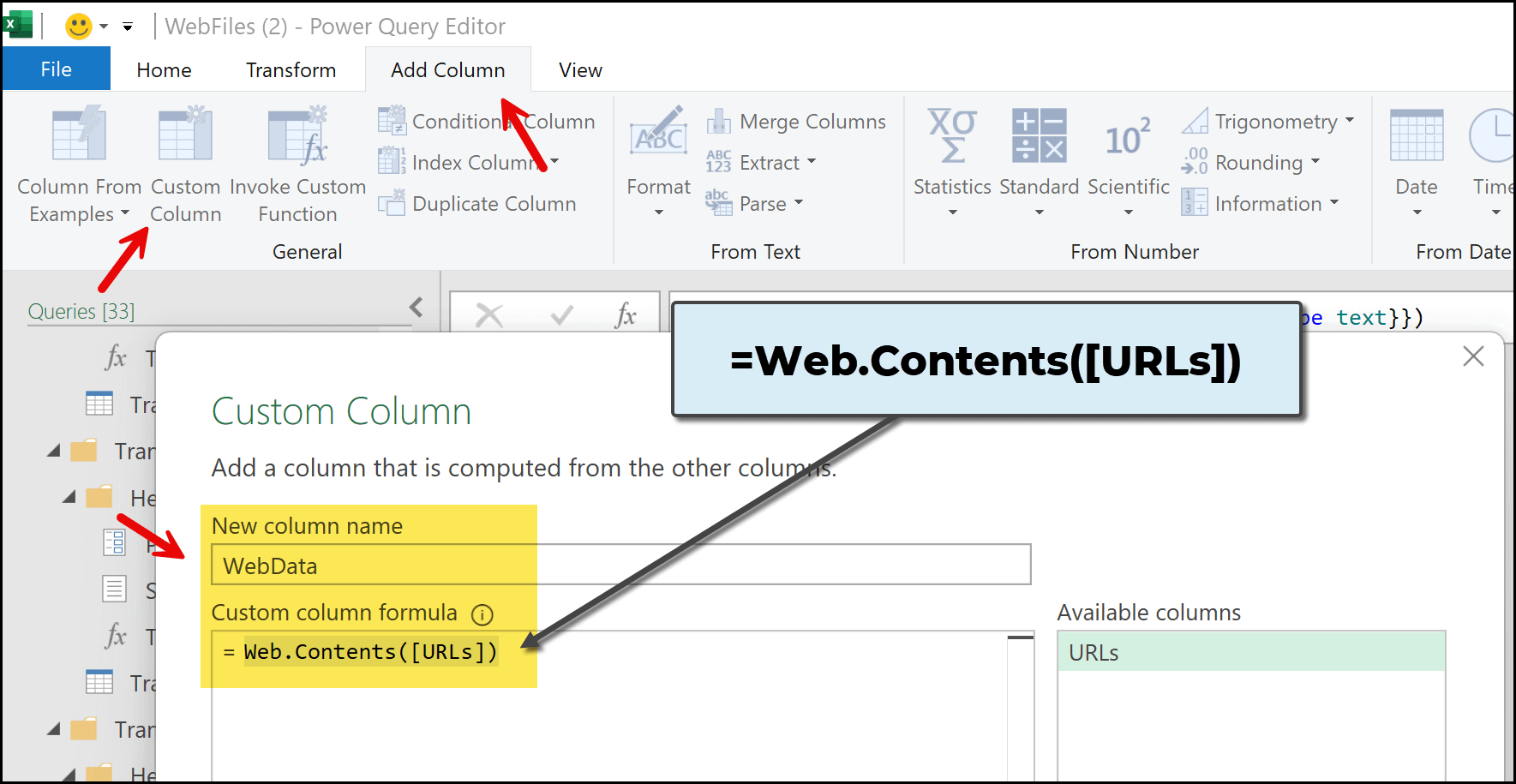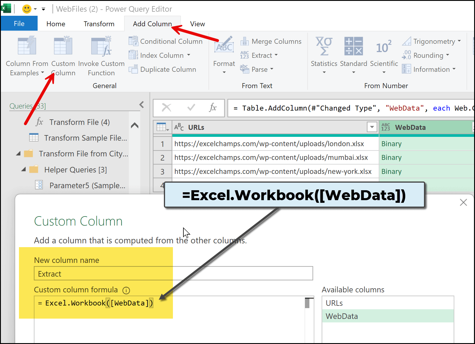 To do this, we need to use a specific formula that allows Power Query to go to each workbook using the file paths and extract data from them. For this, go to the Add Column tab and click on Custom Column. As soon as you click on this button, the Add Custom Column dialog box appears.