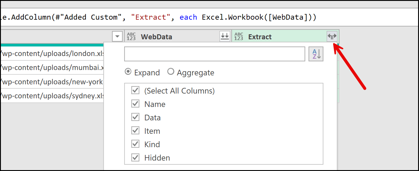 Now we are at the final step to extract the data from the files. I have the third column that I just added using the custom formula. What I’m going to do next is click on the filter button at the top-right of this column.