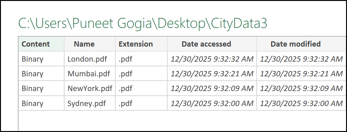 Now, here’s one thing that can feel a bit confusing when you connect to a folder using the From Folder option in Power Query. Excel doesn’t immediately show you the data from the files. Instead, it displays a list of all the files in that folder, along with file details such as when each file was created, last accessed, and other related information.