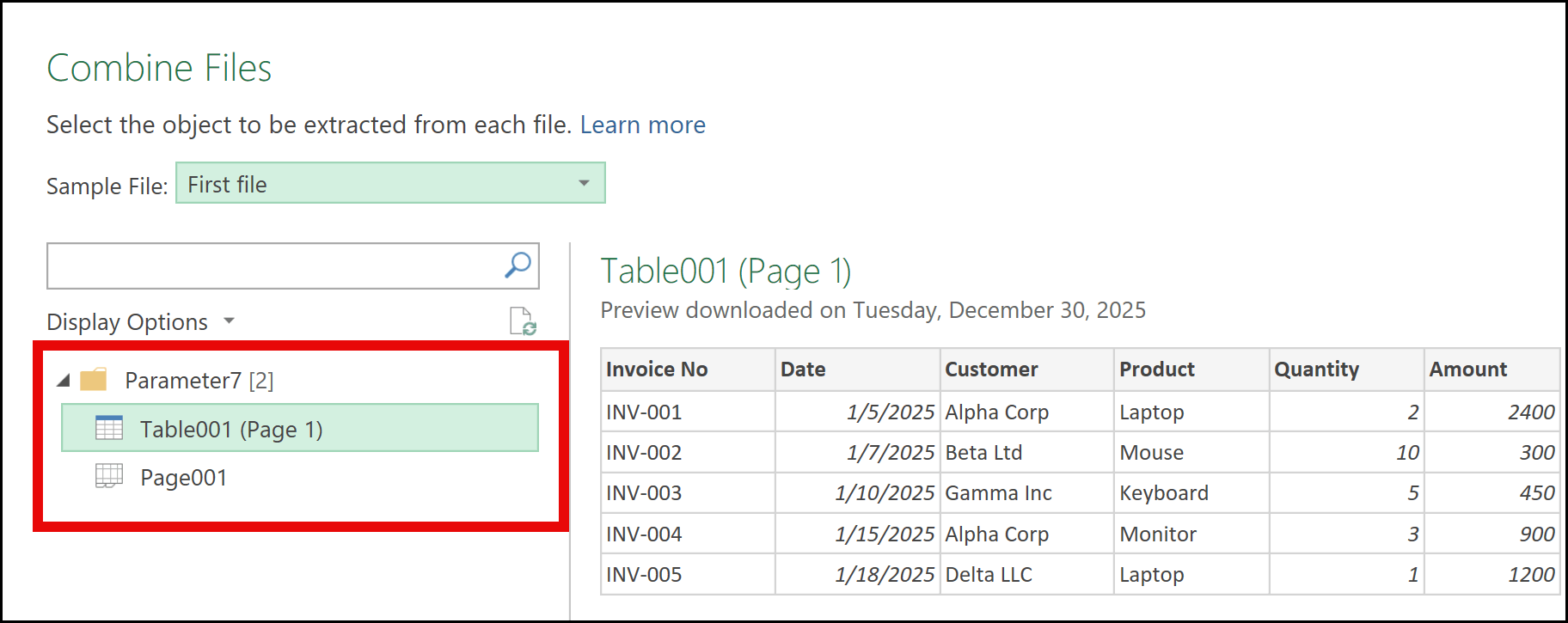 Using the Sample File drop-down, you can preview all the PDF files one by one. Once you’re satisfied and have selected Table 001 as the parameter, click OK.