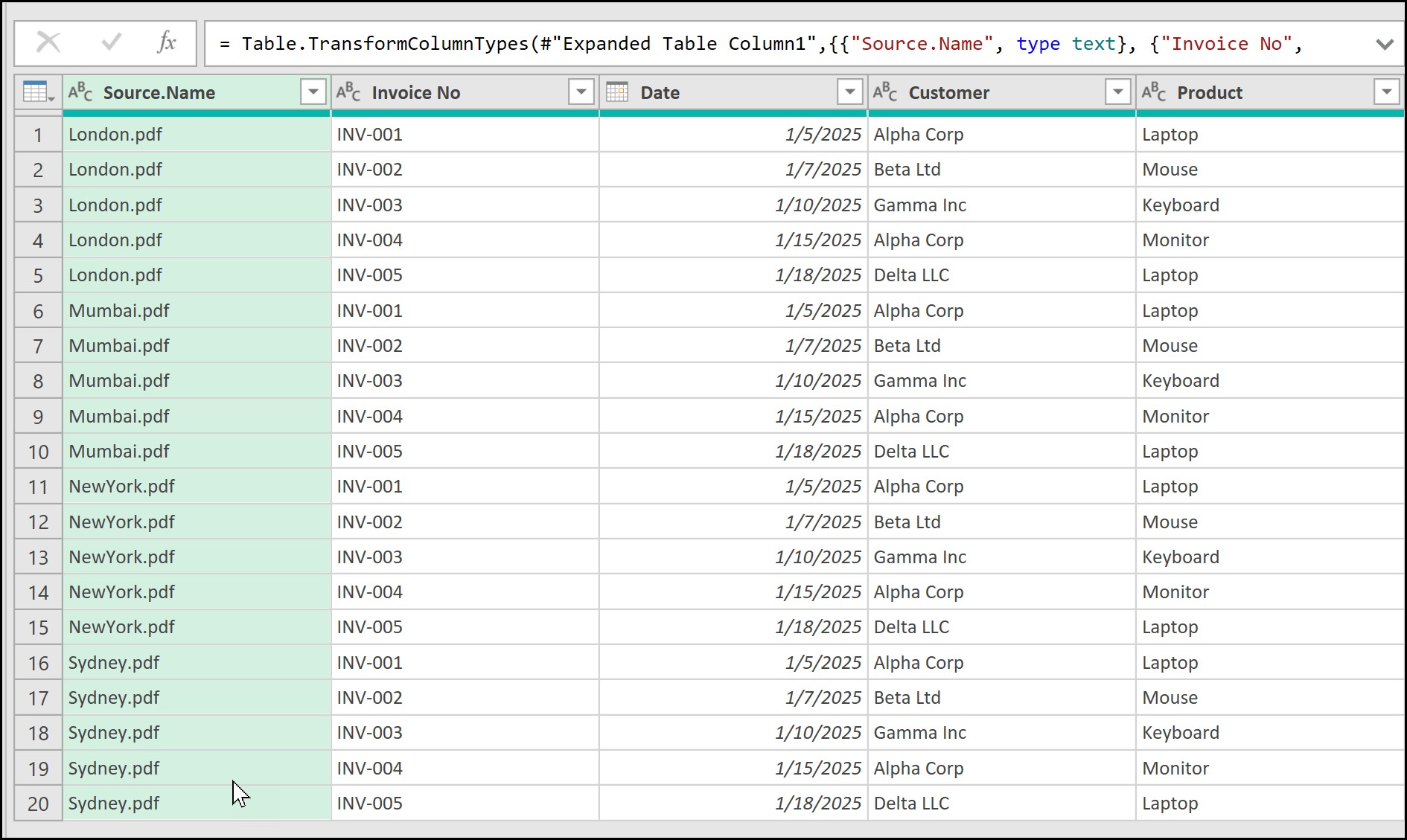 All the columns from the PDF tables are present, along with an additional column at the beginning named Source.Name, which contains the file names such as London, Mumbai, New York, and Sydney.