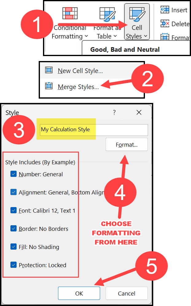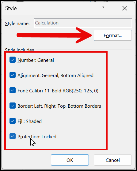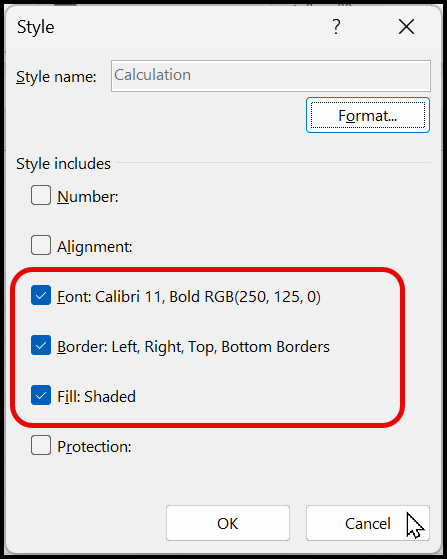 In the top-right corner of the Style dialog box, you’ll find the Format button. Clicking this opens the Format Cells dialog box, where you can change any of the formatting options you want to include in the Calculation Style.