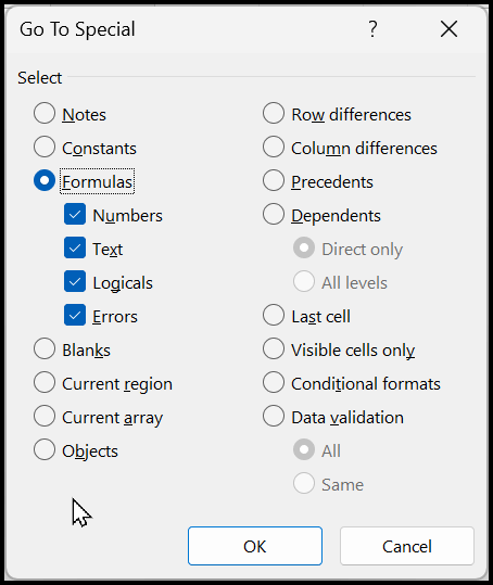 Now, open the Go To Special dialog box and select the Formulas option, which is the third choice on the left. After that, click the OK button. Excel will instantly select all the formula cells in the current worksheet.