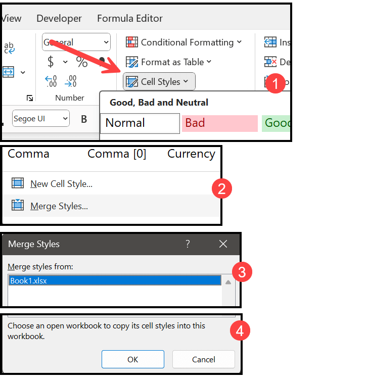 - After that, go to the Home tab in the destination workbook and click Cell Styles in the Styles group. At the bottom of the Cell Styles menu, click Merge Styles.